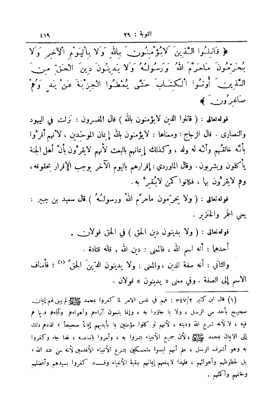 قوله تعالى قاتلوا الذين لا يؤمنون بالله قال المفسرون نزلت في اليهود والنصارى قال الزجاج ومعناها لا يؤمنون بالله إيمان الموحدين لأنهم أقروا بأنه خالقهم وأنه له ولد وكذلك إيمانهم بالبعث لأنهم لا يقرون بأن أهل الجنة يأكلون ويشربون وقال الماوردي إقرارهم باليوم الآخر يوجب الإقرار بحقوقه وهم لا يقرون بها فكانوا كمن لا يقر به