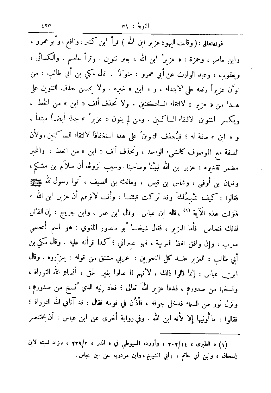 قوله تعالى وقالت اليهود عزير ابن الله قرأ ابن كثير ونافع وابو عمرو وابن عامر وحمزة عزير ابن الله بغير تنوين وقرأ عاصم والكسائي ويعقوب وعبد الوارث عن أبي عمرو منونا قال مكي بن أبي طالب من نون عزيرا رفعه على الابتداء وابن خبره ولا يحسن حذف التنوين على هذا من عزير لالتقاء الساكنين ولا تحذف ألف ابن من الخط ويكسر التنوين لالتقاء الساكنين ومن لم ينون عزيرا جعله أيضا مبتدأ وابن صفة له فيحذف التنوين على هذا استخفافا لالتقاء الساكنين ولأن الصفة مع الموصوف كالشيء الواحد وتحذف ألف ابن من الخط والخبر مضمر تقديره عزير بن الله نبينا وصاحبنا وسبب نزولها أن سلام بن مشكم ونعمان بن أوفى وشاس بن قيس ومالك بن الصيف أتوا رسول الله صلى الله عليه و سلم فقالوا كيف نتبعك وقد تركت قبلتنا وأنت لا تزعم أن عزير ابن الله فنزلت هذه الآية قاله ابن عباس وقال ابن عمر وابن جريج إن القائل لذلك فنحاص فأما العزير فقال شيخنا أبو منصور اللغوي هو اسم أعجمي معرب وإن وافق لفظ العربية فهو عبراني كذا قرأته عليه وقال مكي بن أبي طالب العزير عند كل النحويين عربي مشتق من قوله يعزروه وقال ابن عباس إنما قالوا ذلك لأنهم لما علموا بغير الحق أنساهم الله التوراة ونسخها من صدورهم فدعا عزير الله تعالى فعاد إليه الذي نسخ من صدروهم ونزل نور من السماء فدخل جوفه فأذن في قومه فقال قد آتاني الله التوراة فقالوا ما أوتيها إلا لأنه ابن الله وفي رواية عن ابن عباس أن بختنصر