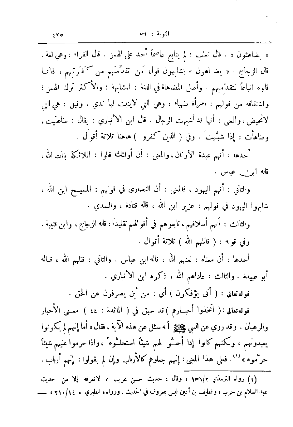 قوله تعالى اتخذوا أحبارهم قد سبق في المائدة معنى الأحبار والرهبان وقد روي عن النبي صلى الله عليه و سلم أنه سئل عن هذه الآية فقال أما إنهم لم يكونوا يعبدونهم ولكنهم كانوا إذا أحلوا لهم شيئا استحلوه واذا حرموا عليهم شيئا حرموه فعلى هذا المعنى إنهم جعلوهم كالأرباب وإن لم يقولوا إنهم أباب