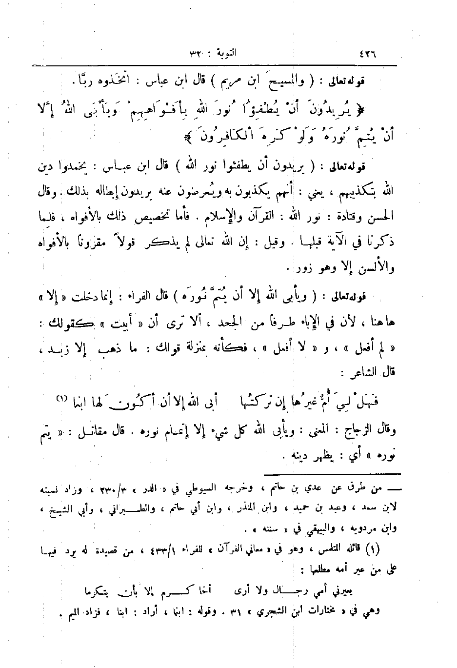 وقال الزجاج المعنى ويأبى الله كل شيء إلا إتمام نوره قال مقاتل يتم نوره أي يظهر دينه