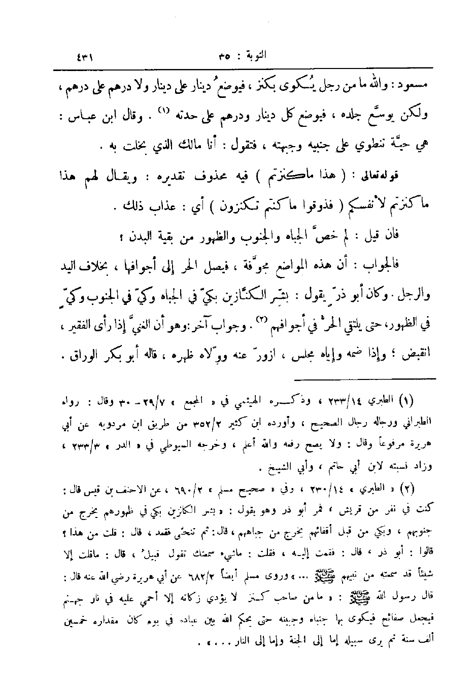 مسعود والله ما من رجل يكوى بكنز فيوضع دينار على دينار ولا درهم على درهم ولكن يوسع جلده فيوضع كل دينار ودرهم على حدته وقال ابن عباس هي حية تنطوي على جنبيه وجبهته فتقول أنا مالك الذي بخلت به