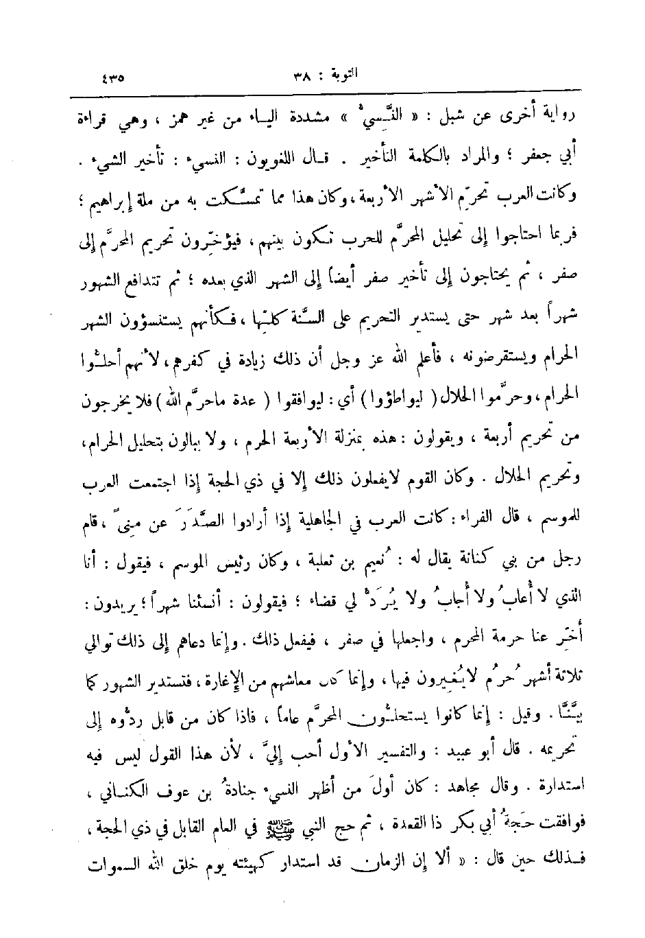 رواية أخرى عن شبل النسي مشددة الياء من غير همز وهي قراءة أبي جعفر والمراد بالكلمة التأخير قال اللغويون النسيء تأخير الشيء وكانت العرب تحرم الأشهر الأربعة وكن هذا مما تمسكت به من ملة إبراهيم فربما احتاجوا إلى تحليل المحرم للحرب تكون بينهم فيؤخرون تحريم المحرم إلى صفر ثم يحتاجون إلى تأخير صفر أيضا إلى الشهر الذي بعده ثم تتدافع الشهور شهرا بعد شهر حتى يستدير التحريم على السنة كلها فكأنهم يستنسؤون الشهر الحرام ويستقرضونه فأعلم الله عز و جل أن ذلك زيادة في كفرهم لأنهم أحلوا الحرام وحرموا الحلال ليواطؤوا أي ليوافقوا عدة ما حرم الله فلا يخرجون من تحريم أربعة ويقولون هذه بمنزلة الأربعة الحرم ولا يبالون بتحليل الحرام وتحريم الحلال وكان القوم لا يفعلون ذلك إلا في ذي الحجة إذا اجتمعت العرب للموسم قال الفراء كانت العرب في الجاهلية إذا أرادوا الصدر عن منى قام رجل من بني كنانة يقال له نعيم بن ثعلبة وكان رئيس الموسم فيقول أنا الذي لا أعاب ولا أجاب ولا يرد لي قضاء فيقولون أنسئنا شهرا يريدون أخر عنا حرمة المحرم واجعلها في صفر فيفعل ذلك وإنما دعاهم إلى ذلك توالي ثلاثة أشهر حرم لا يغيرون فيها وإنما كان معاشهم من الإغارة فتستدير الشهور كما بينا وقيل إنما كانوا يستحلون المحرم عاما فاذا كان من قابل ردوه إلى تحريمه قال أبو عبيد والتفسير الأول أحب إلي لأن هذا القول ليس فيه استدارة وقال مجاهد كان أول من أظهر النسيء جنادة بن عوف الكناني فوافقت حجة أبي بكر ذا القعدة ثم حج النبي صلى الله عليه و سلم في العام القابل في ذي الحجة فذلك حين قال ألا إن الزمان قد استدار كهيئته يوم خلق الله السموات