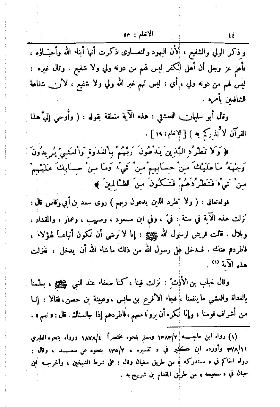 قوله تعالى ولا تطرد الذين يدعون ربهم روى سعد بن أبي وقاص قال نزلت هذه الآية في ستة في وفي ابن مسعود وصهيب وعمار والمقداد وبلال قالت قريش لرسول الله صلى الله عليه و سلم إنا لا نرضى أن نكون أتباعا لهؤلاء فاطردهم عنك فدخل على رسول الله من ذلك ما شاء الله أن يدخل فنزلت هذه الآية