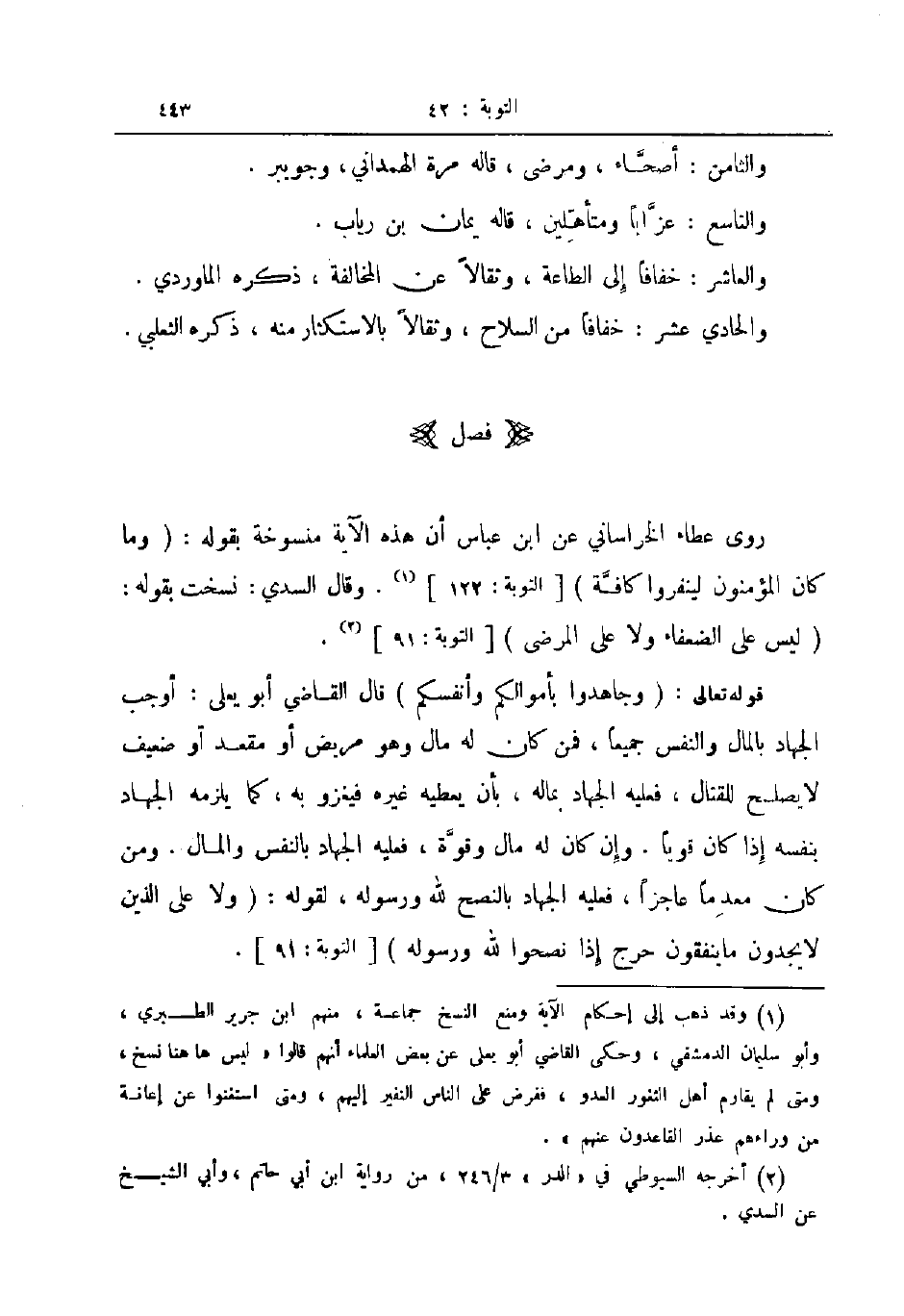 روى عطاء الخراساني عن ابن عباس ان هذه الآية منسوخة بقوله وما كان المؤمنون لينفروا كافة وقال السدي نسخت بقوله ليس على الضعفاء ولا على المرضى