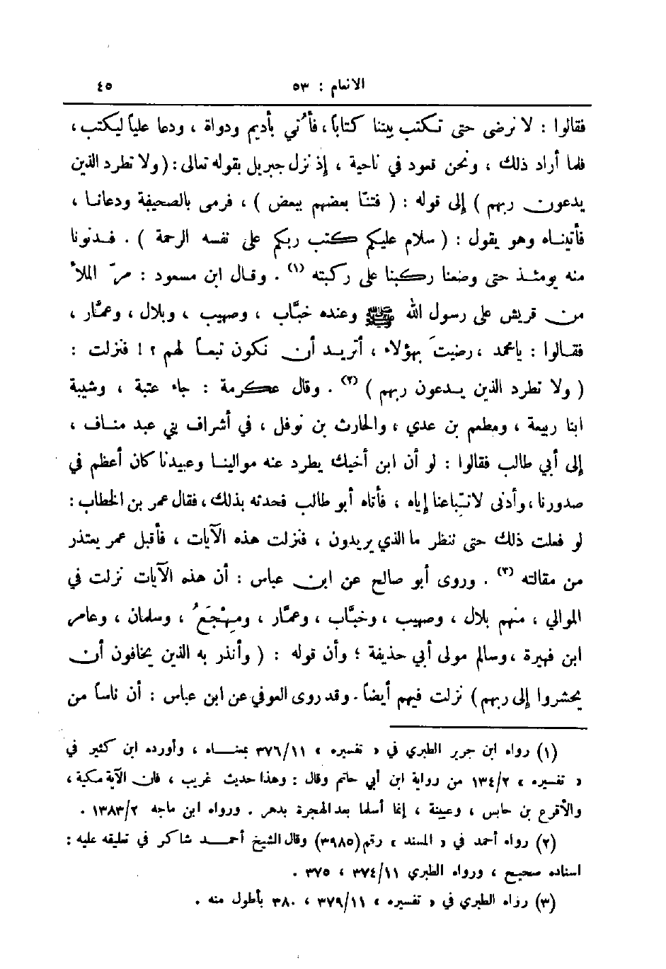 فقالوا لا نرضى حتى تكتب بيننا كتابا فأتى بأديم ودواة ودعا عليا ليكتب فلما أراد ذلك ونحن قعود في ناحية إذ نزل جبريل بقوله تعالى ولا تطرد الذين يدعون ربهم إلى قوله فتنا بعضهم ببعض فرمى بالصحيفة ودعانا فأتيناه وهو يقول سلام عليكم كتب ربكم على نفسه الرحمة فدنونا منه يومئذ حتى وضعنا ركبنا على ركبته وقال ابن مسعود مر الملأ من قريش على رسول الله صلى الله عليه و سلم وعنده خباب وصهيب وبلال وعمار فقالوا يا محمد رضيت بهؤلاء أتريد أن نكون تبعا لهم فنزلت ولا تطرد الذين يدعون ربهم وقال عكرمة جاء عتبة وشيبة ابنا ربيعة ومطعم بن عدي والحارث بن نوفل في أشراف بني عبد مناف إلى أبي طالب فقالوا لو أن ابن أخيك يطرد عنه موالينا وعبيدنا كان أعظم في صدورنا وأدنى لاتباعنا إياه فأتاه أبو طالب فحدثه بذلك فقال عمر بن الخطاب لو فعلت ذلك حتى ننظر ما الذي يريدون فنزلت هذه الآيات فأقبل عمر يعتذر من مقالته وروى أبو صالح عن ابن عباس أن هذه الآيات نزلت في الموالي منهم بلال وصهيب وخباب وعمار ومهجع وسلمان وعامر ابن فهيرة وسالم مولى أبي حذيفة وأن قوله وأنذر به الذين يخافون أن يحشروا إلى ربهم نزلت فيهم أيضا وقد روى العوفي عن ابن عباس أن ناسا من