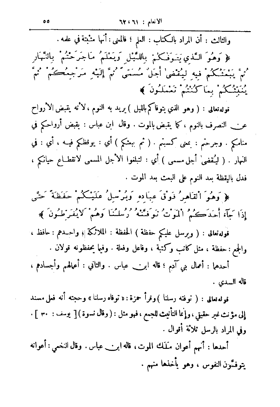 قوله تعالى وهو الذي يتوفكم بالليل يريد به النوم لأنه يقبض الأرواح عن التصرف بالنوم كما يقبض بالموت وقال ابن عباس يقبض أرواحكم في منامكم وجرحتم بمعنى كسبتم ثم يبعثكم أي يوقظكم فيه أي في النهار ليقضى أجل مسمى أي لتبلغوا الأجل المسمى لانقطاع حياتكم فدل باليقظة بعد النوم على البعث بعد الموت