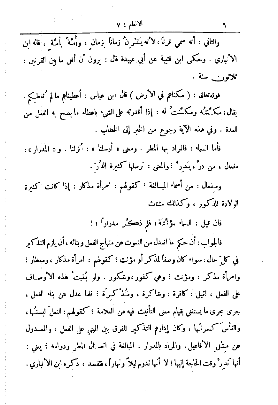 فالجواب أن حكم ما انعدل من النعوت عن منهاج الفعل وبنائه أن يلزم التذكير في كل حال سواء كان وصفا لمذكر أو مؤنت كقولهم امرأة مذكار ومعطار وامرأة مذكر ومؤنث وهي كفور وشكور ولو بنيت هذه الأوصاف على الفعل لقيل كافرة وشاكرة ومذكرة فلما عدل عن بناء الفعل جرى مجرى ما يستغني بقيام معنى التأنيث فيه عن العلامة كقولهم النعل لبستها والفأس كسرتها وكان إيثارهم التذكير للفرق بين المبني على الفعل والمعدول عن مثل الأفاعيل والمراد بالمدرار المبالغة في اتصال المطر ودوامه يعني أنها تدر وقت الحاجة إليها لا أنها تدوم ليلا ونهارا فتفسد ذكره ابن الأنباري