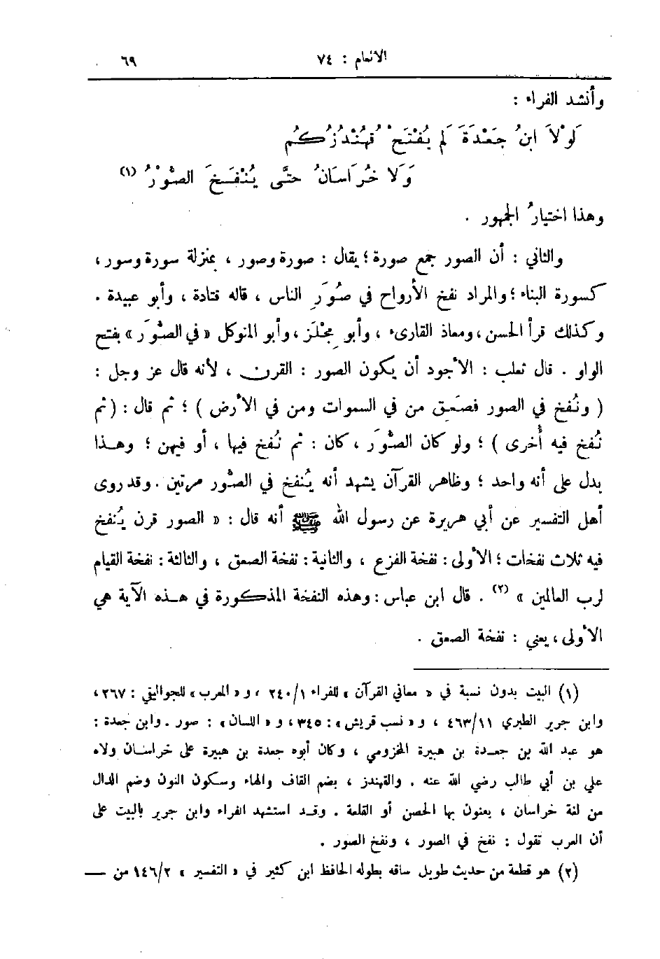 والثاني أن الصور جمع صورة يقال صورة وصور بمنزلة سورة وسور كسورة البناء والمراد نفخ الأرواح في صورة الناس قاله قتادة وأبو عبيدة وكذلك قرأ الحسن ومعاذ القارئ وأبو مجلز وأبو المتوكل في الصور بفتح الواو قال ثعلب الأجود أن يكون الصور القرن لأنه قال عز و جل ونفخ في الصور فصعق من في السماوات ومن في الأرض ثم قال ثم نفخ فيه أخرى ولو كان الصور كان ثم نفخ فيها أو فيهن وهذا يدل على أنه واحد وظاهر القرآن يشهد أنه ينفخ في الصور مرتين وقد روى أهل التفسير عن أبي هريرة عن رسول الله صلى الله عليه و سلم أنه قال الصور قرن ينفخ فيه ثلاث نفخات الأولى نفخة الفزع والثانية نفخة الصعق والثالثة نفخة القيامة لرب العالمين قال ابن عباس وهذه النفخة المذكورة في هذه الآية هي الأولى يعني نفخة الصعق