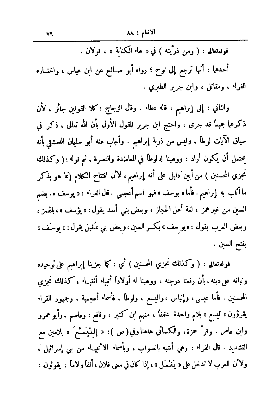 والثاني إلى إبراهيم قاله عطاء وقال الزجاج كلا القولين جائز لأن ذكرهما جميعا قد جرى واحتج ابن جرير للقول الأول بأن الله تعالى ذكر في سياق الآيات لوطا وليس من ذرية إبراهيم وأجاب عنه أبو سليمان الدمشقي بأنه يحتمل أن يكون أراد ووهبنا له لوطا في المعاضدة والنصرة ثم قوله وكذلك نجزي المحسنين من أبين دليل على انه إبراهيم لأن افتتاح الكلام إنما هو بذكر ما أثاب به إبراهيم فأما يوسف فهو اسم أعجمي قال الفراء يوسف بضم السين من غير همز لغة أهل الحجاز وبعض بني أسد يقول يؤسف بالهمز وبعض العرب يقول يوسف بكسر السين وبعض بني عقيل يقول يوسف بفتح السين