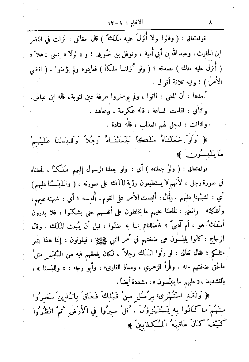 قوله تعالى وقالوا لولا أنزل عليه ملك قال مقاتل نزلت في النضر ابن الحارث وعبد الله بن أبي أمية ونوفل بن خويلد ولولا بمعنى هلا أنزل عليه ملك نصدقه ولو أنزلنا ملكا فعاينوه ولم يؤمنوا لقضي الأمر وفيه ثلاثة اقوال