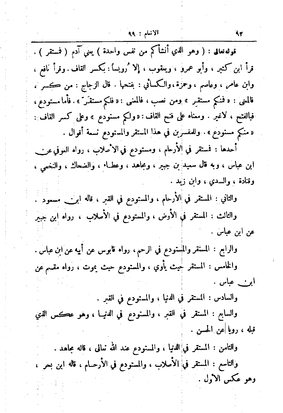 قوله تعالى وهو الذي أنشأكم من نفس واحدة يعني آدم فمستقر قرأ ابن كثير وأبو عمرو ويعقوب إلا رويسا بكسر القاف وقرأ نافع وابن عامر وعاصم وحمزة والكسائي بفتحها قال الزجاج من كسر فالمعنى فمنكم مستقر ومن نصب فالمعنى فلكم مستقر فأما مستودع فبالفتح لا غير ومعناه على فتح القاف ولكم مستودع وعلى كسر القاف منكم مستودع وللمفسرين في هذا المستقر والمستودع تسعة أقوال