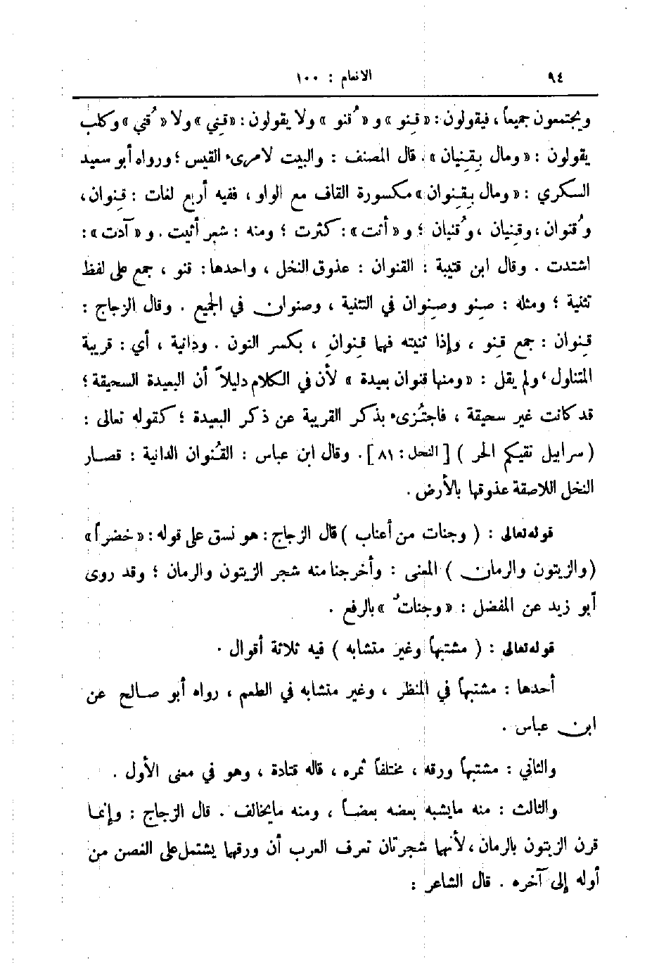 ويجتمعون جميعا فيقولون قنو وقنو ولا يقولون قني ولا قني وكلب يقولون ومال بقنيان قال المصنف والبيت لامرئ القيس ورواه أبو سعيد السكري ومال بقنوان مكسورة القاف مع الواو ففيه أربع لغات قنوان وقنوان وقنيان وقنيان وأثت كثرت ومنه شعر أثيت وآدت اشتدت وقال ابن قتيبة القنوان عذوق النخل واحدها قنو جمع على لفظ تثنية ومثله صنو وصنوان في التثنية وصنوان في الجمع وقال الزجاج قنوان جمع قنو وإذا ثنيته فهما قنوان بكسر النون ودانية أي قريبة المتناول ولم يقل ومنها قنوان بعيدة لأن في الكلام دليلا أن البعيدة السحيقة قد كانت غير سحيقة فاجتزئ بذكر القريبة عن ذكر البعيدة كقوله تعالى سرابيل تقيكم الحر وقال ابن عباس القنوان الدانية قصار النخل اللاصقة عذوقها بالأرض