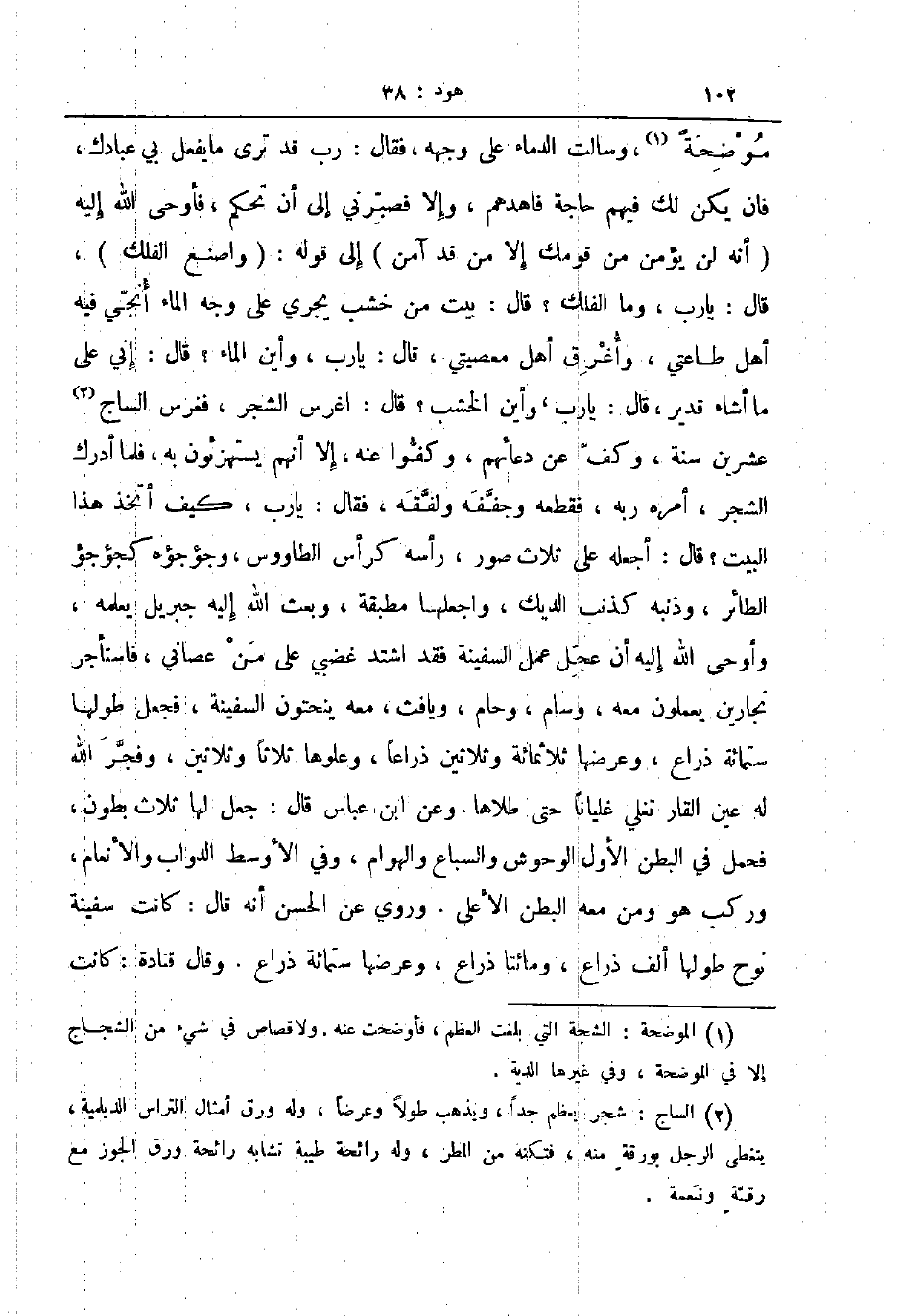 موضحة وسالت الدماء على وجهه فقال رب قد ترى مايفعل بي عبادك فان يكن لك فيهم حاجة فاهدهم وإلا فصبرني إلى أن تحكم فأوحى الله إليه أنه لن يؤمن من قومك إلا من قد آمن إلى قوله واصنع الفلك قال يارب وما الفلك قال بيت من خشب يجري على وجه الماء أنجي فيه أهل طاعتي وأغرق أهل معصيتي قال يارب وأين الماء قال إني على ما أشاء قدير قال يارب وأين الخشب قال اغرس الشجر فغرس الساج عشرين سنة وكف عن دعائهم وكفوا عنه إلا أنهم يستهزؤن به فلما أدرك الشجر أمره ربه فقطعه وجففه ولفقه فقال يارب كيف أتخذ هذا البيت قال اجعله على ثلاث صور رأسه كرأس الطاووس وجؤجؤه كجؤجؤ الطائر وذنبه كذنب الديك واجعلها مطبقة وبعث الله إليه جبريل يعلمه وأوحى إليه أن عجل عمل السفينة فقد اشتد غضبي على من عصاني فاستأجر نجارين يعملون معه وسام وحام ويافث معه ينحتون السفينة فجعل طولها ستمائة ذراع وعرضها ثلاثمائة وثلاثين ذراعا وعلوها ثلاثا وثلاثين وفجر الله له عين القار تغلي غليانا حتى طلاها