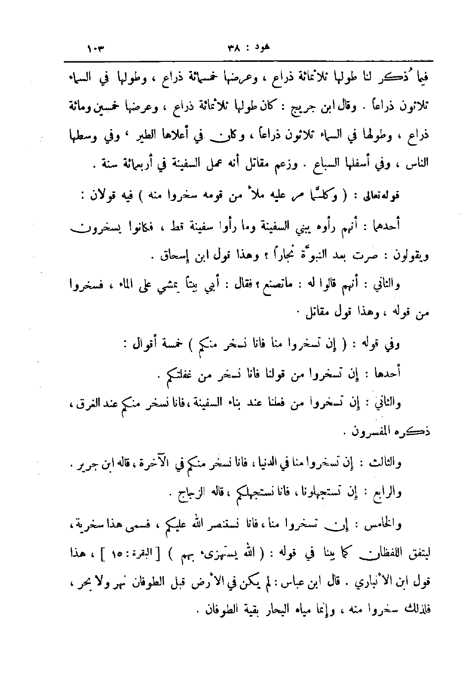 وقال ابن جريج كان طولها ثلاثمائة ذراع وفرضها خمسين ومائة ذراع وطولها في السماء ثلاثون ذراع وكان في أعلاها الطيروفي وسطها الناس وفي أسفلها السباع وزعم مقاتل أنه عمل السفينة في أربعمائة سنة
