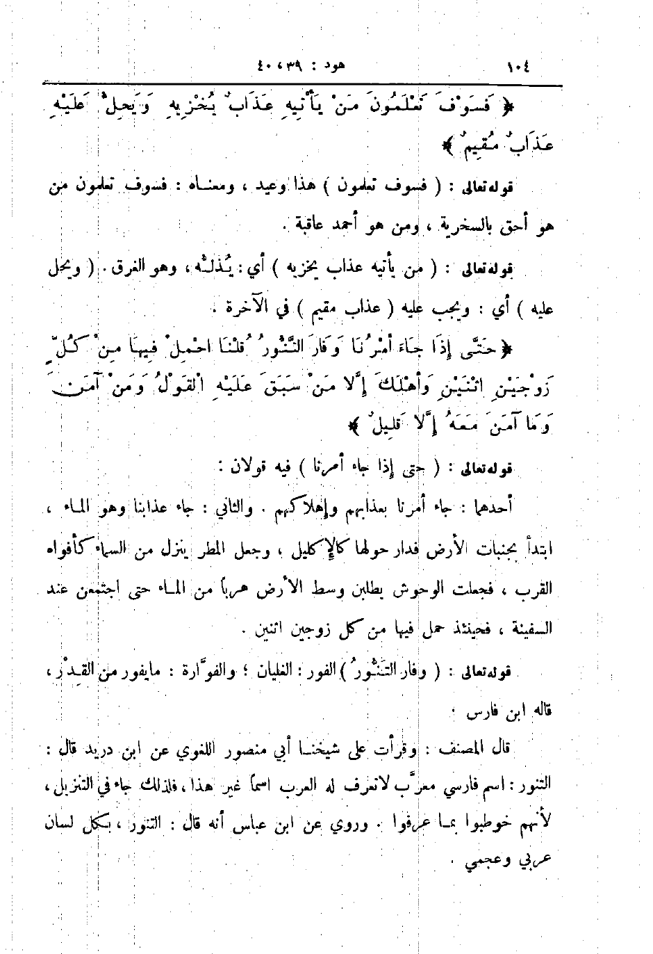 قوله تعالى حتى إذا جاء أمرنا فيه قولان أحدهما جاء أمرنا بعذابهم وإهلاكهم والثاني جاء عذابنا و هو الماء ابتدأ بجنبات الأرض فدار حولها كالإكليل وجعل المطر ينزل من السماء كأفواه القرب فجعلت الوحوش يطلبن وسط الأرض هربا من الماء حتى اجتمعن عند السفينة فحينئذ حمل فيها من كل زوجين اثنين قوله تعالى وفار التنور الفور الغليان والفوارة ما يفور من القدر قاله ابن فارس