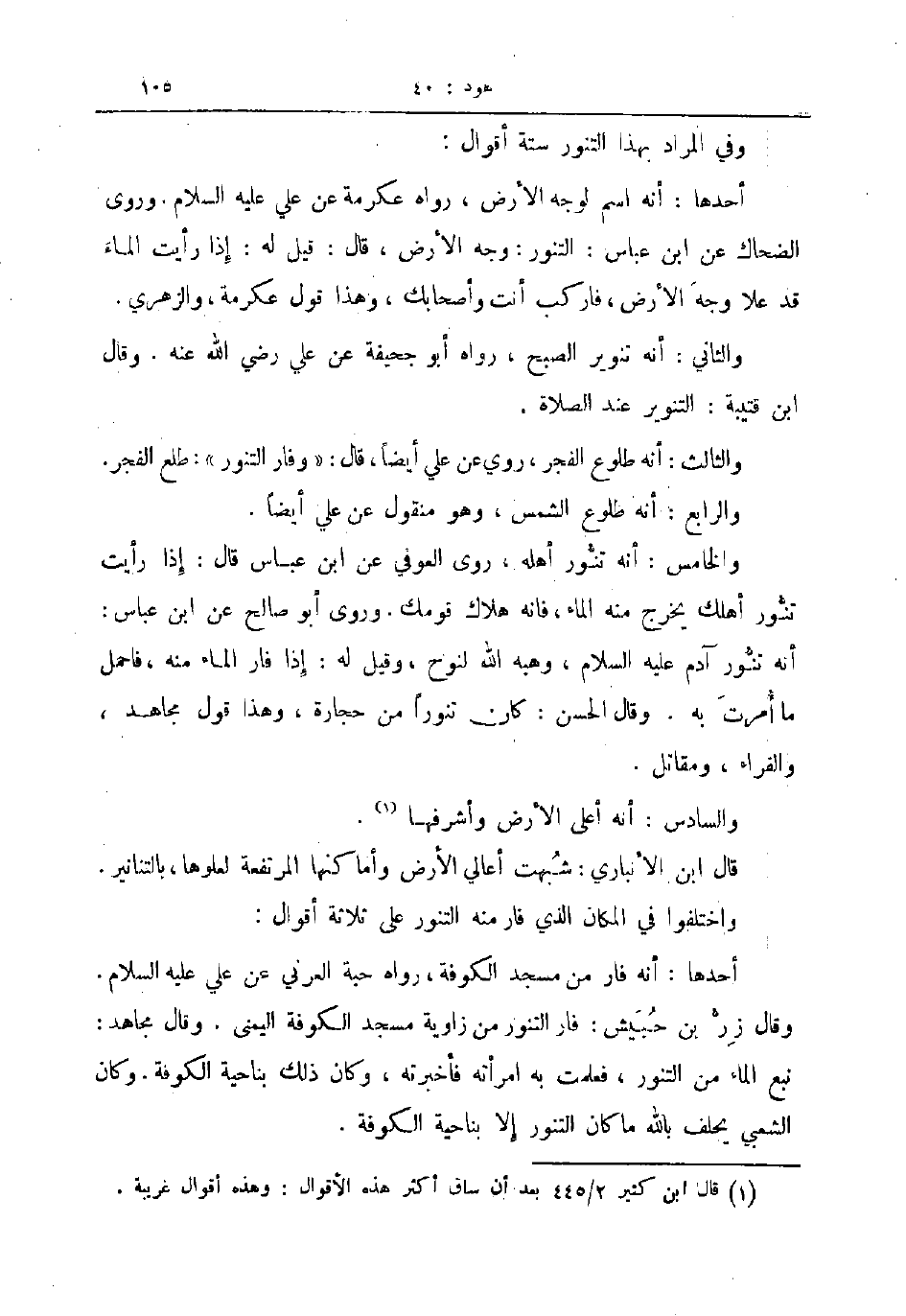 قال ابن الأنباري شبهت أعالي الأرض وأماكنها المرتفعة لعلوها بالتنانير واختلفوا في المكان الذي فار منه التنور على ثلاثة أقوال