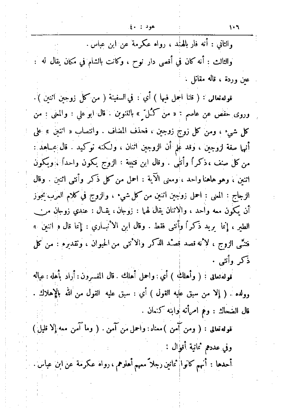 وروى حفص عن عاصم من كل بالتنوين قال أبو علي والمعنى من كل شيء ومن كل زوج زوجين فحذف المضاف وانتصاب اثنين على أنهما صفة لزوجين وقد علم أن الزوجين اثنان ولكنه توكيد قال مجاهد من كل صنف ذكرا وأنثى وقال ابن قتيبة الزوج يكون واحدا ويكون اثنين وهو هاهنا واحد ومعنى الآية احمل من كل ذكر وأنثى اثنين وقال الزجاج المعنى احمل زوجين اثنين من كل شىء والزوج في كلام العرب يجوز أن يكون معه واحد والاثنان يقال لهما زوجان يقال عندي زوجان من الطير إنما يريد ذكرا وأنثى فقط وقال ابن الأنباري إنما قال اثنين فثنى الزوج لأنه قصد قصد الذكر والأنثى من الحيوان وتقديره من كل ذكر وأنثى