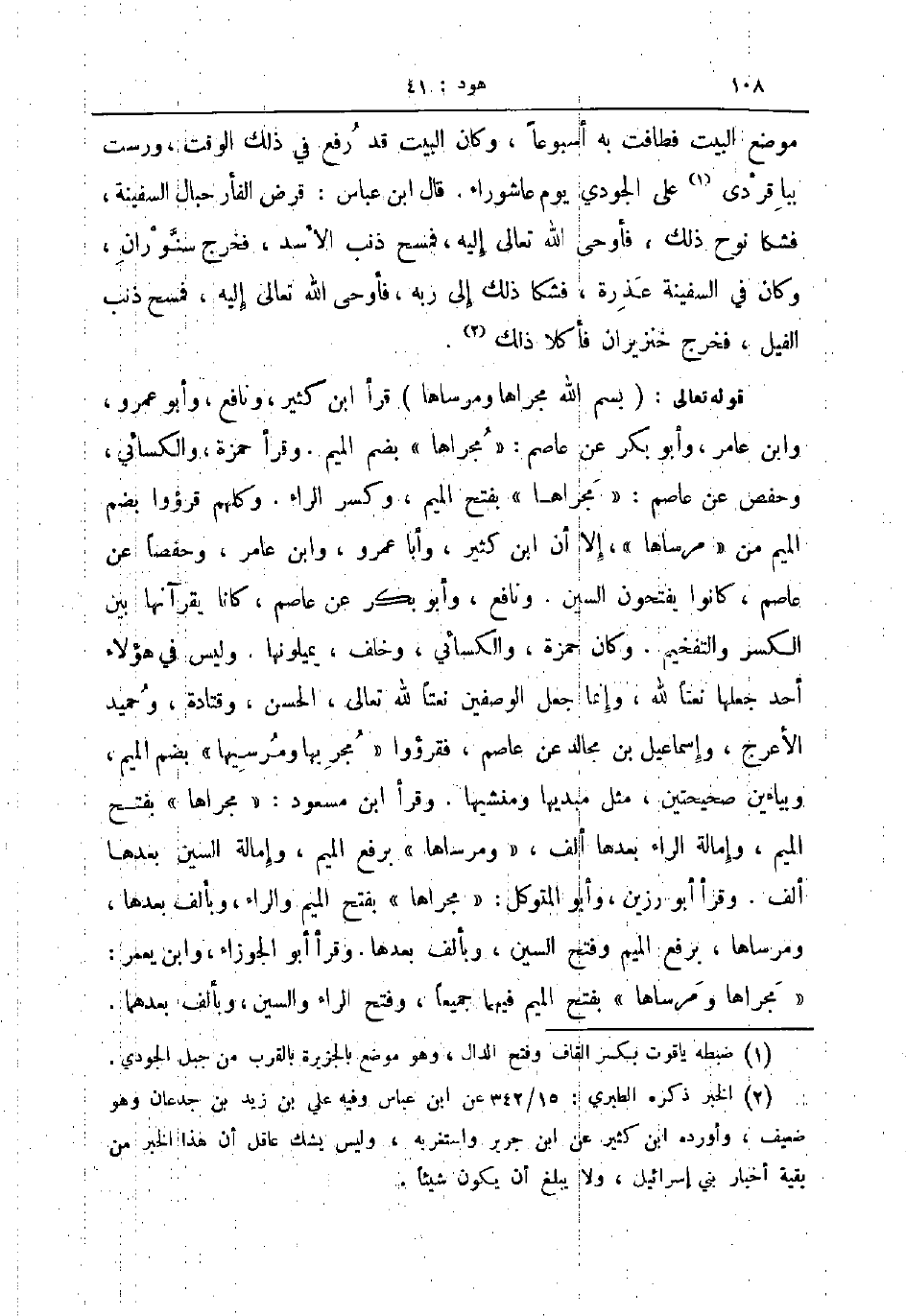 قوله تعالى بسم الله مجراها ومرساها قرأ ابن كثير ونافع وأبو عمرو وابن عامر وأبوبكر عن عاصم مجراها بضم الميم وقرأ حمزة والكسائي وحفص عن عاصم مجراها بفتح الميم وكسر الراء وكلهم قرؤوا بضم الميم من مرساها إلا أن ابن كثير وأبا عمرو وابن عامر وحفصا عن عاصم كانوا يفتحون السين ونافع وأبو بكر عن عاصم كانا يقرآنها بين الكسر والتفخيم وكان حمزة والكسائي وخلف يميلونها وليس في هؤلاء أحد جعلها نعتا لله وإنما جعل الوصفين نعتا لله تعالى الحسن وقتادة وحميد الأعرج وإسماعيل بن مجالد عن عاصم فقرؤوا مجريها و مرسيها بضم الميم وببهاءين صحيحتين مثل مبديها ومنشيها وقرأ ابن مسعود مجراها بفتح الميم وإمالة الراء بعدها ألف ومرساها برفع الميم وإمالة السين بعدها ألف وقرأ أبو رزين وأبوالمتوكل مجراها بفتح الميم والراء وبألف بعدها ومرساها برفع الميم وفتح السين وبألف بعدها وقرأ أبو الجوزاء وابن يعمر مجراها ومرساها بفتح الميم فيهما جميعا وفتح الراء والسين وبألف بعدهما