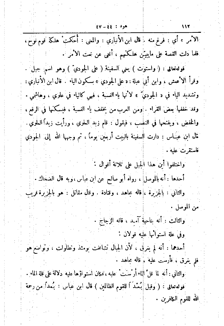 قوله تعالى واستوت يعني السفينة على الجودي وهو اسم جبل وقرأ الأعمش وابن أبي عبلة على الجودي بسكون الياء قال ابن الأنباري وتشديد الياء في الجودي لأنها ياء النسبه فهي كالياء في علوي وهاشمي وقد خففها بعض القراء ومن العرب من يخفف ياء النسبه فيسكنها في الرفع والخفض ويفتحها في النصب فيقول قام زيد العلوي ورأيت زيدا العلوي