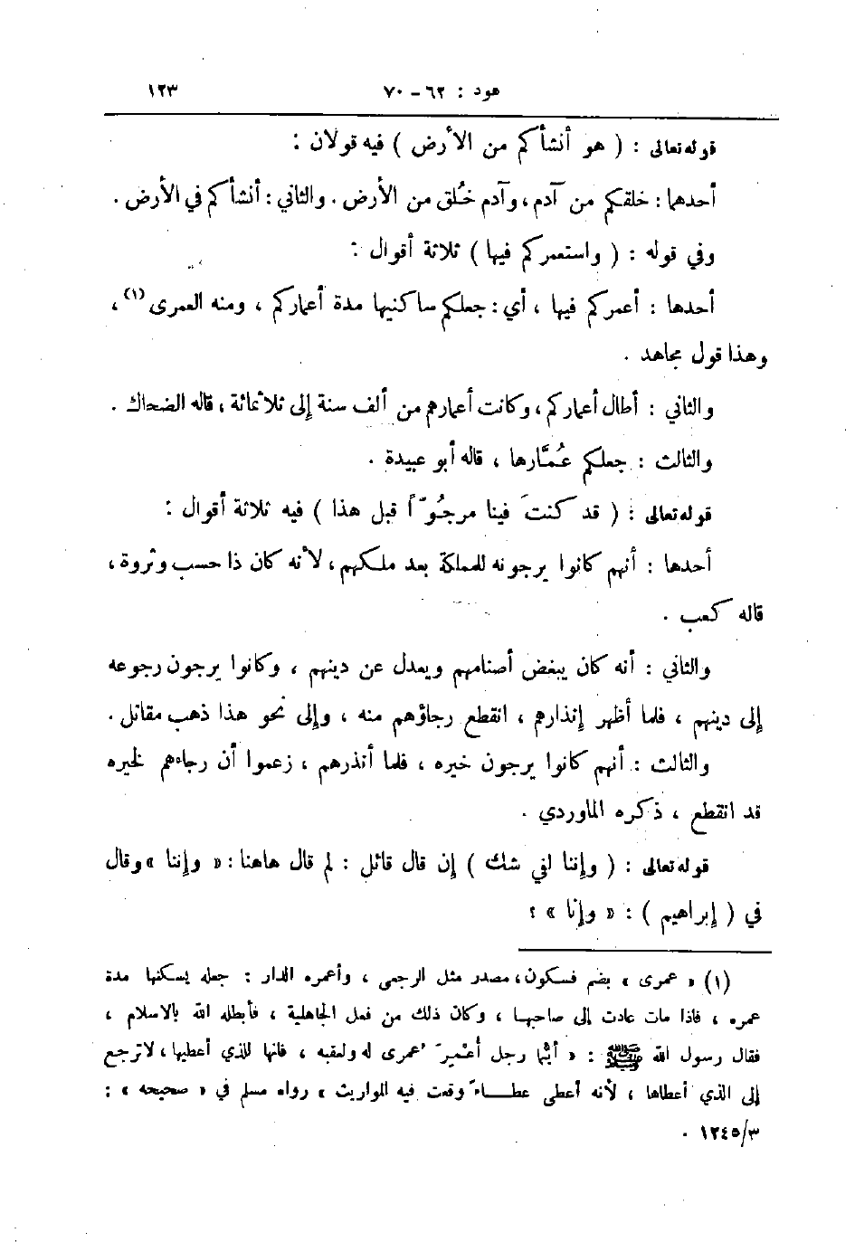 أحدها أعمركم فيها أي جعلكم ساكنيها مدة أعماركم ومنه العمرى وهذا قول مجاهد