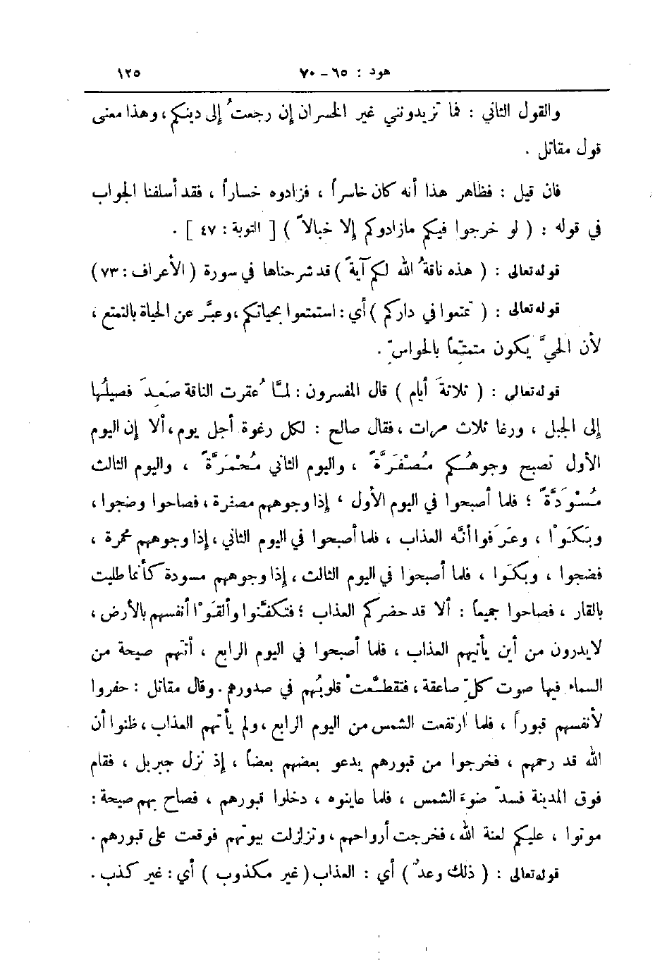 قوله تعالى ثلاثة أيام قال المفسرون لما عقرت الناقة صعد فصيلها إلى الجبل ورغا ثلاث مرات فقال صالح لكل رغوة أجل يوم ألا إن اليوم الأول تصبح وجوهكم مصفرة واليوم الثاني محمرة واليوم الثالث مسودة فلما أصبحوا في اليوم الأول إذا وجوههم مصفرة فصاحوا وضجوا وبكوا وعرفوا أنه العذاب فلما أصبحوا في اليوم الثاني إذا وجوههم محمرة فضجوا وبكوا فلما أصبحوا في اليوم الثالث إذا وجوههم مسودة كأنما طليت بالقار فصاحوا جميعا ألا قد حضركم العذاب فتكفنوا وألقوا أنفسهم بالأرض لا يدرون من أين يأتيهم العذاب فلما أصبحوا في اليوم الرابع أتتهم صيحة من السماء فيها صوت كل صاعقة فتقطعت قلوبهم في صدورهم وقال مقاتل حفروا لأنفسهم قبورا فلما ارتفعت الشمس من اليوم الرابع ولم يأتهم العذاب ظنوا أن الله قد رحمهم فخرجوا من قبورهم يدعو بعضهم بعضا إذ نزل جبريل فقام فوق المدينة فسد ضوء الشمس فلما عاينوه دخلوا قبورهم فصاح بهم صيحة موتوا عليكم لعنة الله فخرجت أرواحهم وتزلزلت بيوتهم فوقعت على قبورهم قوله تعالى ذلك وعد أي العذاب غير مكذوب أي غير كذب