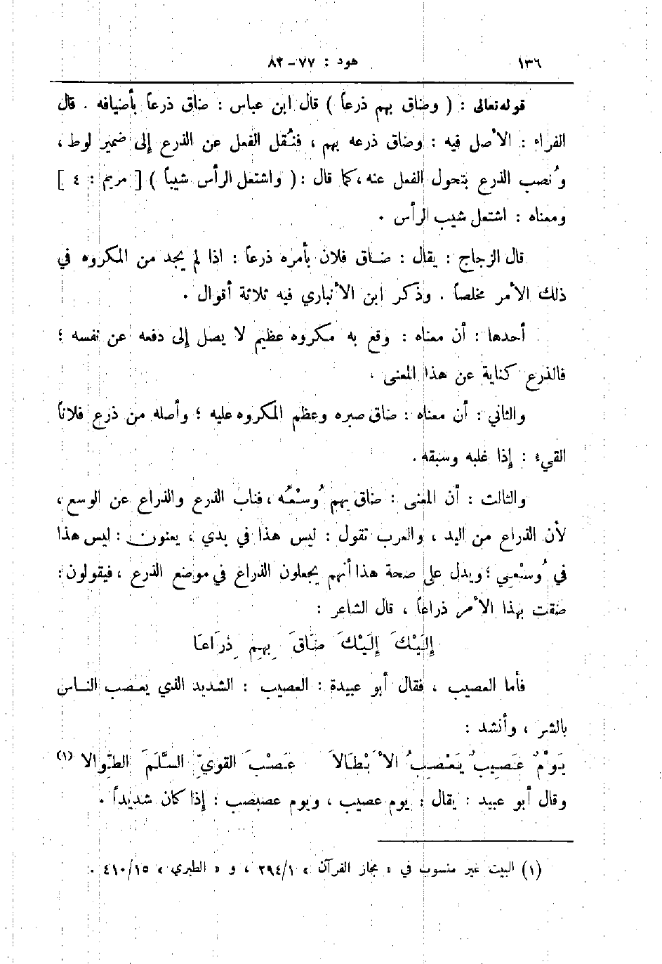 قوله تعالى وضاق بهم ذرعا قال ابن عباس ضاق ذرعا بأضيافه قال الفراء الأصل فيه وضاق ذرعه بهم فنقل الفعل عن الذرع إلى ضمير لوط ونصب الذرع بتحول الفعل عنه كما قال واشتعل الرأس شيبا مريم 4 ومعناه اشتعل شيب الرأس