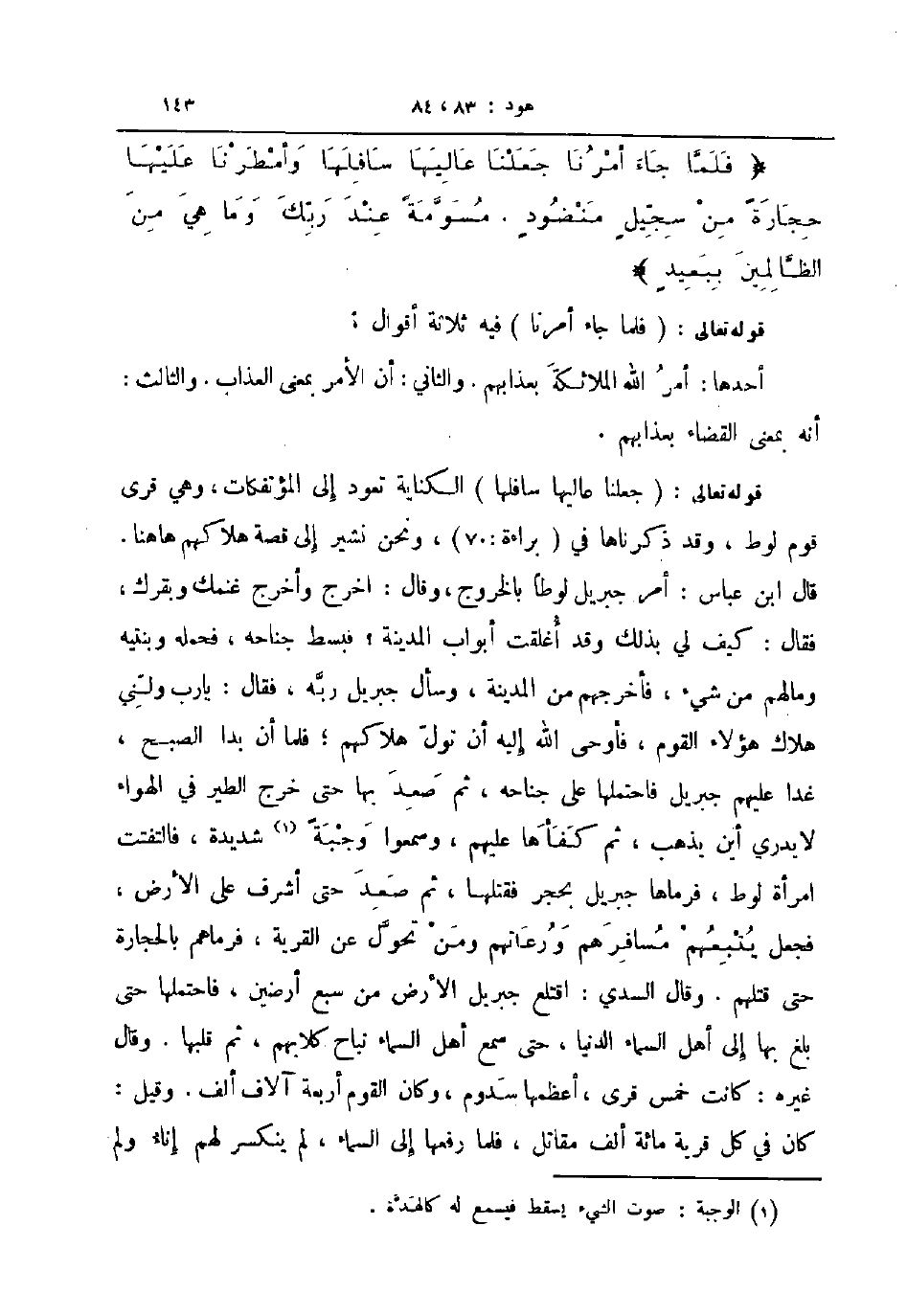 قوله تعالى جعلنا عاليها سافلها الكناية تعود إلى المؤتفكات وهي قرى قوم لوط وقد ذكرناها في براءة 70 ونحن نشير إلى قصة هلاكهم ها هنا قال ابن عباس أمر جبريل لوطا بالخروج وقال اخرج وأخرج غنمك وبقرك فقال كيف لي بذلك وقد أغلقت أبواب المدينة فبسط جناحه وحمله وبنتيه ومالهم شيء فأخرجهم من المدينة وسأل جبريل ربه فقال يا رب ولني هلاك هؤلاء القوم فأوحى الله إليه أن تول هلاكهم فلما أن بدا الصبح غدا عليهم جبريل فاحتملها على جناحه ثم صعد بها حتى خرج الطير في الهواء لا يدري أين يذهب ثم كفأها عليهم وسمعوا وجبة شديدة فالتفت امرأة لوط فرماها جبريل بحجر فقتلها ثم صعد حتى أشرف على الأرض فجعل يتبعهم مسافرهم ورعاتهم ومن تحول عن القرية فرماهم بالحجارة حتى قتلهم وقال السدي اقتلع جبريل الأرض من سبع أرضين فاحتملها حتى بلغ بها إلى أهل السماء الدنيا حتى سمع أهل السماء نباح كلابهم ثم قلبهاوقال غيره كانت خمس قرى أعظمها سدوم وكان القوم أربعة آلاف ألف وقيل كان في كل قرية مائة ألف مقاتل فلما رفعها إلى السماء لم ينكسر لهم إناء ولم