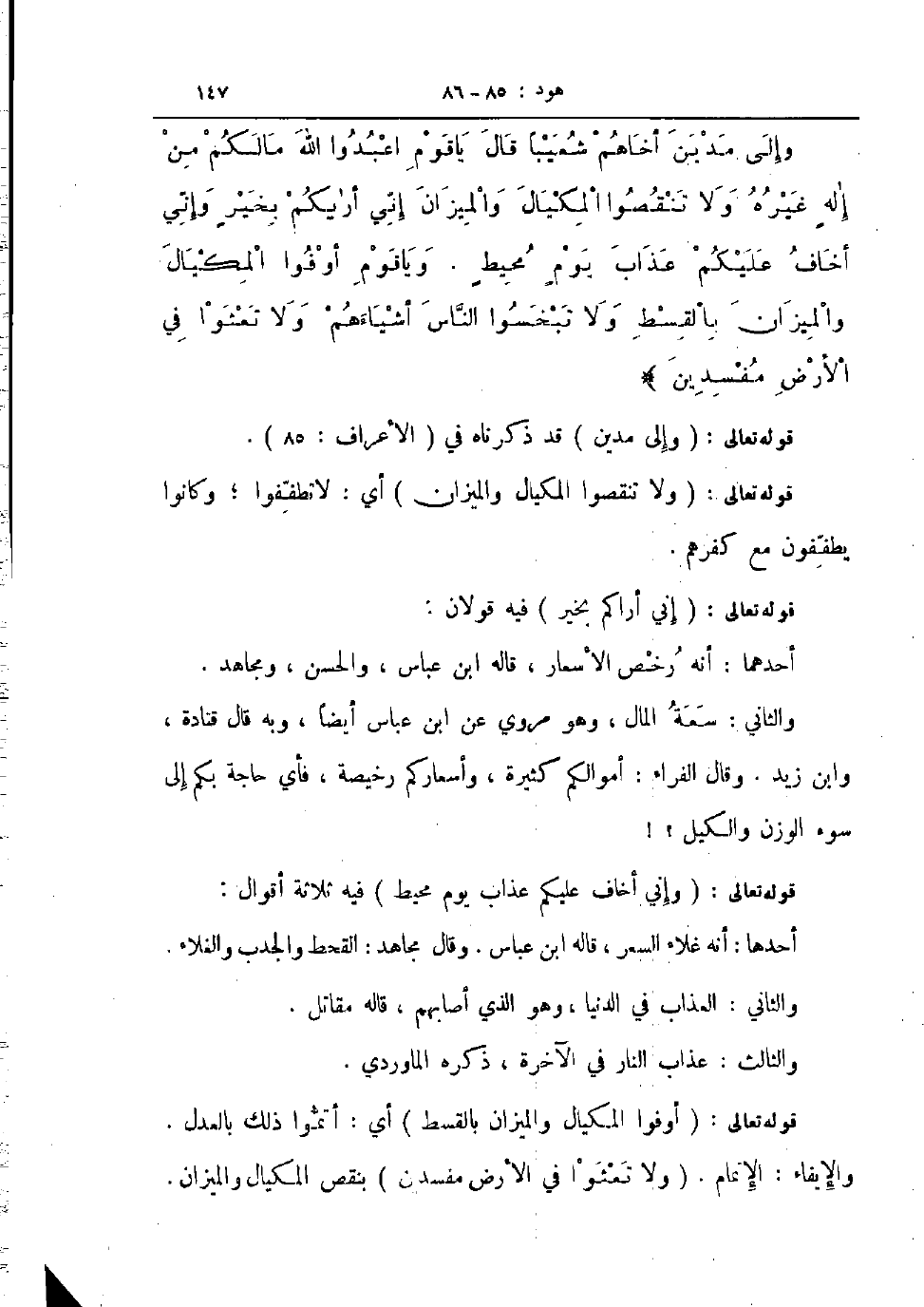 وإلى مدين أخاهم شعيبا قال يا قوم اعبدوا الله ما لكم من إله غيره ولاتنقصوا المكيال والميزان إني أرايكم بخير وإني أخاف عليكم عذاب يوم محيط ويا قوم أوفوا المكيال والميزان بالقسط ولا تبخسوا الناس أشياءهم ولا تعثوا في الأرض مفسدين