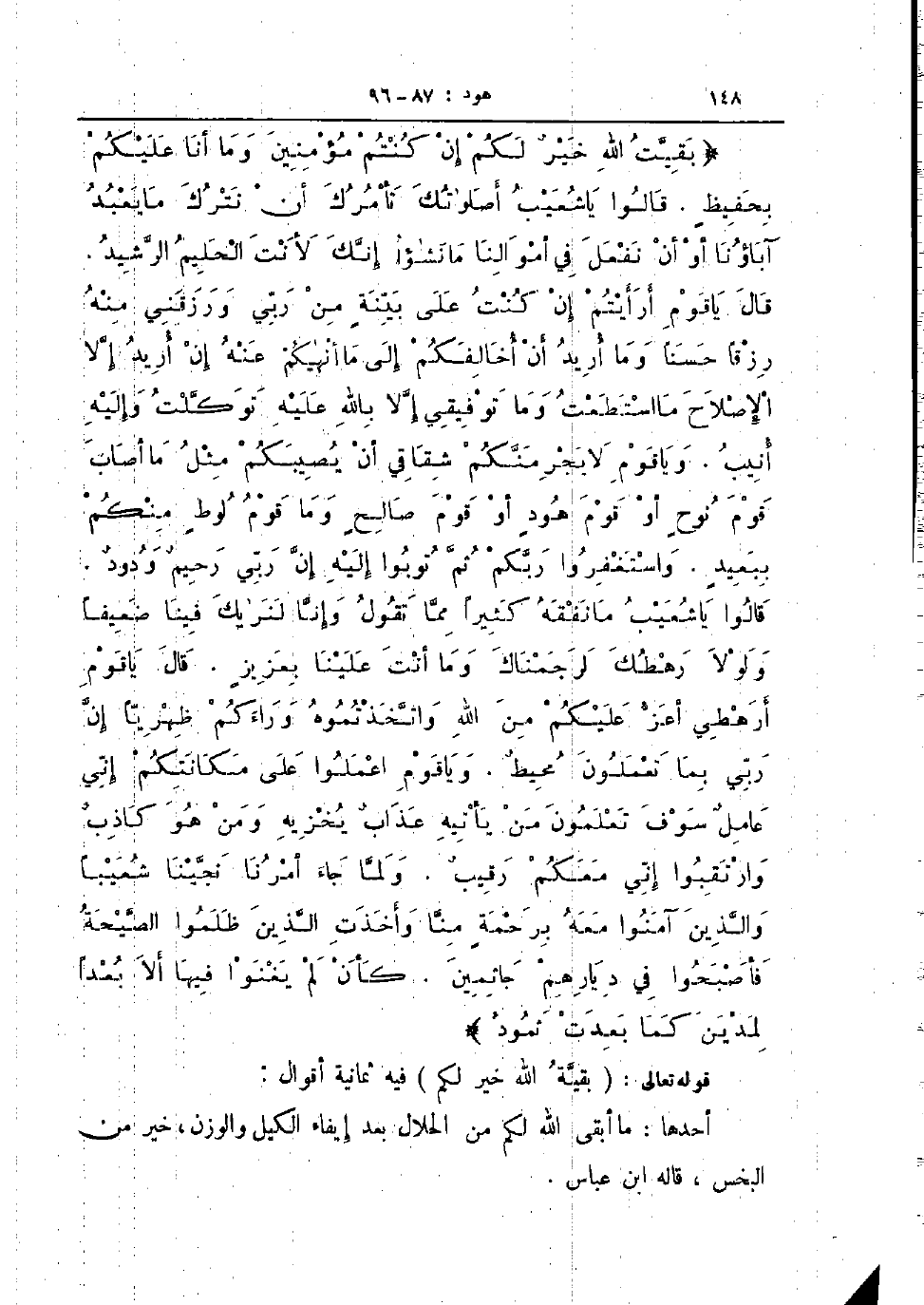 بقيت الله خير لكم إن كنتم مؤمنين وما أنا عليكم بحفيظ قالوا يا شعيب أصلوتك تأمرك أن تترك ما يعبد آباؤنا أو أن نفعل في أموالنا ما نشؤا إنك لأنت الحليم الرشيد قال يا قوم أرأيتم إن كنت على بينة من ربي ورزقني منه رزقا حسنا وما أريد أن أخالفكم إلى ما أنهيكم عنه إن أريد إلا الإصلاح ما استطعت وما توفيقي إلا بالله عليه توكلت وإليه أن أنيب ويا قوم لا يجر منكم شقاقي أن يصيبكم مل مثل أصاب قوم نوح أو قوم هود أو قوم صالح وما قوم لوط منكم ببعيد واستغفروا ربكم ثم توبوا إليه إن ربي رحيم ودود قالوا يا شعيب ما نفقة كثيرا مما تقول وإنا لنريك فينا ضعيفا ولولا رهطك لرجمناك وما أنت علينا بعزيز قال يا قوم أرهطي أعز عليكم من الله واتخذتموه وراءكم ظهريا إن ربي بما تعملون محيط ويا قوم اعملوا على مكانتكم إني عامل سوف تعملون من يأتيه عذاب يخزيه ومن هو كاذب وارتقبوا إني معكم رقيب ولما جاء أمرنا نجينا شعيبا والذين آمنوا معه برحمة منا وأخذت الذين ظلموا الصيحة فأصبحوا في ديارهم جاثمين كأن لم يغنوا فيها ألا بعدا لمدين كما بعدت ثمود