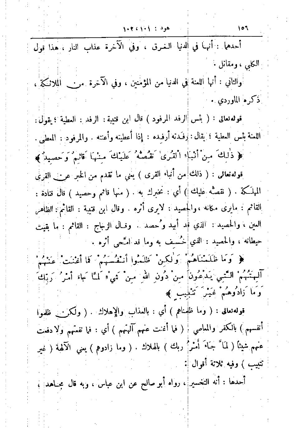 قوله تعالى ذلك من أنباء القرى يعني ما تقدم من الخبر عن القرى المهلكة نقصه عليك أي نخبرك به منها قائم وحصيد قال قتادة القائم ما يرى مكانه والحصيد لا يرى أثره وقال ابن قتيبة القائم الظاهر العين والحصيد الذي قد أبيد وحصد وقال الزجاج القائم ما بقيت حيطانه والحصيد الذي خسف به وما قد امحى أثره وما ظلمناهم ولكن ظلموا أنفسهم فما أغنت عنهم آلهتهم التي يدعون من دون الله من شيء لما جاء أمر ربك وما زادوهم غير تتبيب