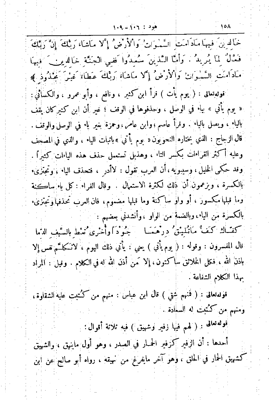 قوله تعالى يوم يأت قرأ ابن كثير ونافع وأبو عمرو والكسائي يوم يأتي بياء في الوصل وحذفوها في الوقف غير أن ابن كثير كان يقف بالياء ويصل بالياء وقرأ عاصم وابن عامر وحمزة بغير ياء في الوصل والوقف قال الزجاج الذي يختاره النحويون يوم يأتي باثبات الياء والذي في المصحف وعليه أكثر القراءات بكسر التاء وهذيل تستعمل حذف هذه الياءات كثيرا وقد حكى الخليل وسيبويه أن العرب تقول لا أدر فتحذف الياء وتجتزئ بالكسرة ويزعمون أن ذلك لكثرة الاستعمال وقال الفراء كل ياء ساكنة وما قبلها مكسور أو واو ساكنة وما قبلها مضموم فإن العرب تحذفها وتجتزئ بالكسرة من الياء وبالضمة من الواو وانشدني بعضهم ... كفاك كف ما تليق درهما ... جودا وأخرى تعط بالسيف الدما ...