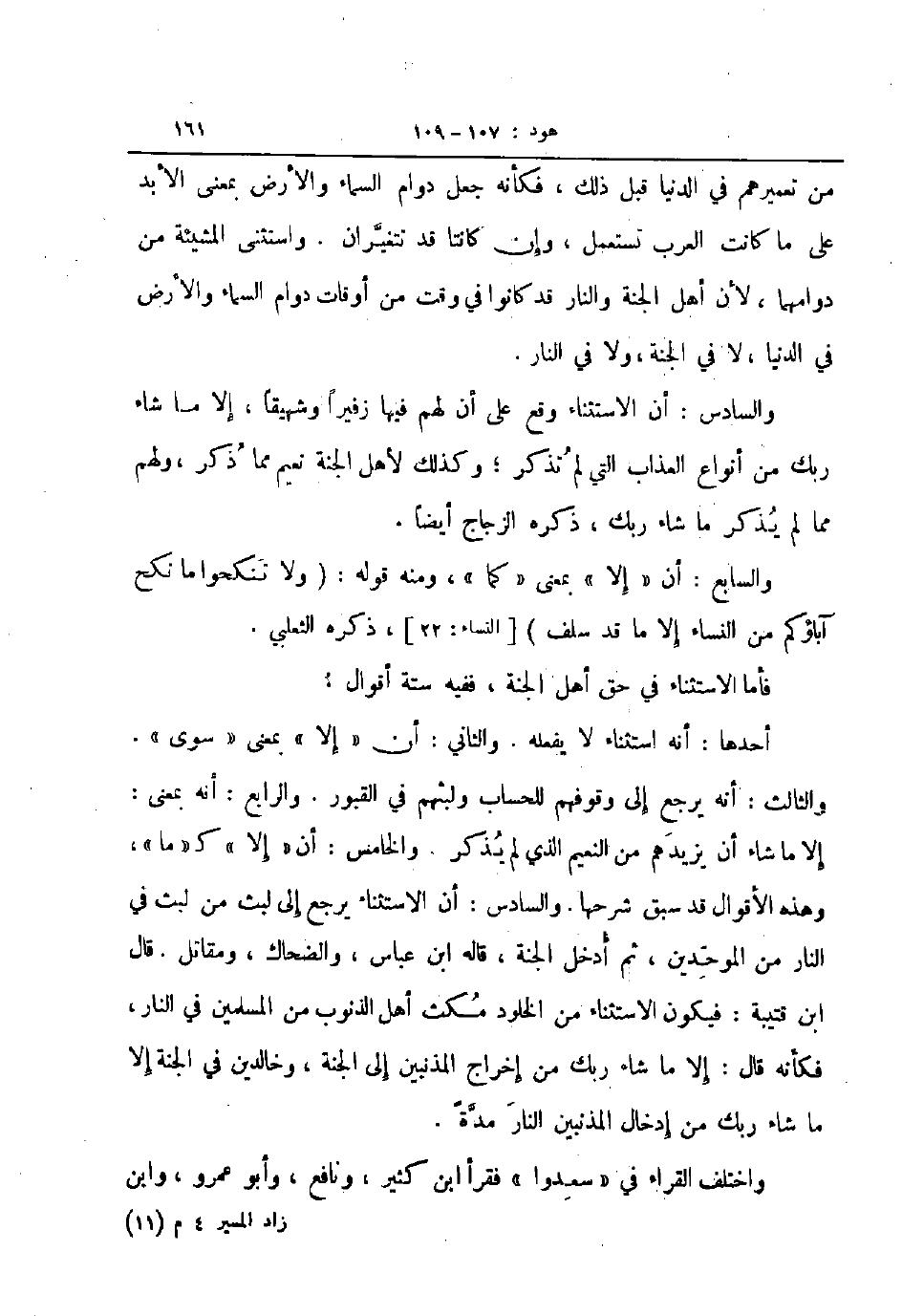 أحدها أنه استثناء لا يفعله والثاني أن إلا بمعنى سوى والثالث أنه يرجع إلى وقوفهم للحساب ولبثهم في القبور والرابع أنه يمعنى إلا ما شاء أن يزيدهم من النعيم الذي لم يذكر والخامس أن إلا ك ما وهذه الأقوال قد سبق شرحها والسادس أن الاستثناء يرجع إلى لبث من لبث في النار من الموحدين ثم أدخل الجنة قاله ابن عباس والضحاك ومقاتل قال ابن قتيبة فيكون الاستثناء من الخلود مكث أهل الذنوب من المسلمين في النار فكأنه قال إلا ما شاء ربك من أخراج المذنبين إلى الجنة وخالدين في الجنة إلا ما شاء ربك من إدخال المذنبين النار مدة