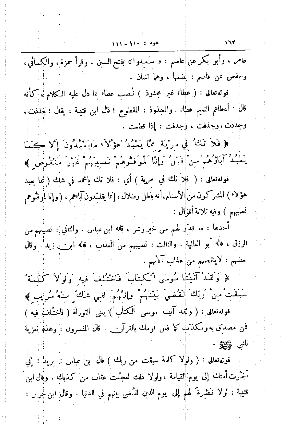 قوله تعالى عطاء غير مجذوذ نصب عطاء بما دل عليه الكلام كأنه قال أعطاهم النعيم عطاء والمجذوذ المقطوع قال ابن قتيبة يقال جذذت وجددت وجذفت وجدفت إذا قطعت فلا تك في مرية مما يعبد هؤلاء ما يعبدون إلا كما يعبد آباؤهم من قبل وإنا لموفوهم نصيبهم غير منقوص