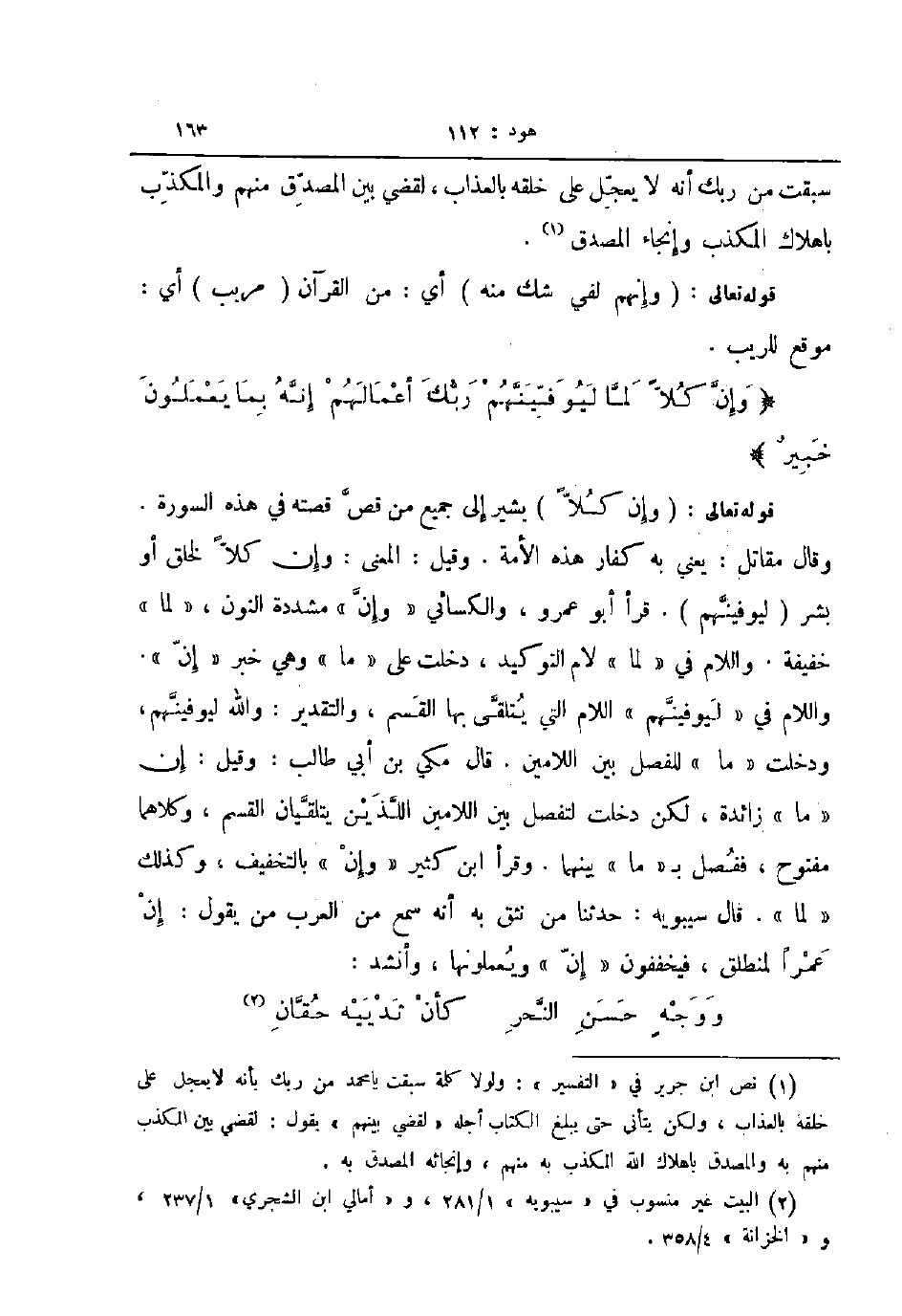 قوله تعالى وإن كلا يشير إلى جميع من قص قصته في هذه السورة وقال مقاتل يعني به كفار هذه الأمة وقيل المعنى وإن كلا لخلق أو بشر ليوفينهم قرأ أبو عمرو والكسائي وإن مشددة النون لما خفيفة واللام في لما لام التوكيد دخلت على ما وهي خبر إن واللام في ليوفينهم اللام التي يتلقى بها القسم والتقدير والله ليوفينهم ودخلت ما للفصل بين اللامين قال مكي بن أبي طالب وقيل إن ما زائدة لكن دخلت لتفصل بين اللامين اللذين يتلقيان القسم وكلاهما مفتوح ففصل ب ما بينهمأ وقرأ ابن كثير وإن بالتخفيف وكذلك لما قال سيبويه حدثنا من نثق به أنه سمع من العرب من يقول إن عمرا لمنطلق فيخففون إن ويعملونها وأنشد ... ووجه حسن النحر ... كأن ثدييه حقان
