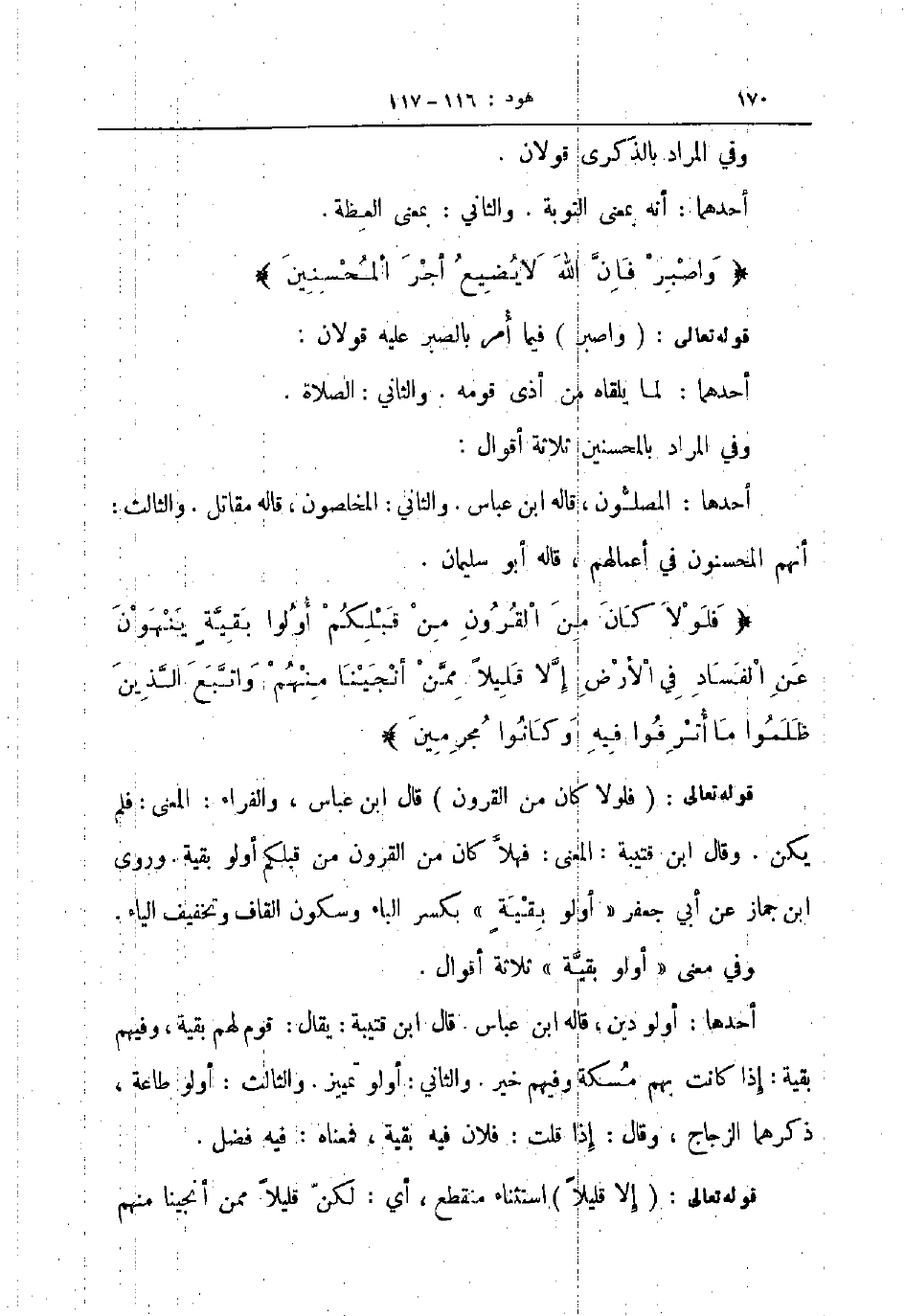 قوله تعالى فلولا كان من القرون قال ابن عباس والفراء المعنى فلم يكن وقال ابن قتيبة المعنى فهلا كان من القرون من قبلكم أولو بقية وروى ابن جماز عن أبي جعفر أولو بقية بكسر الباء وسكون القاف وتخفيف الياء