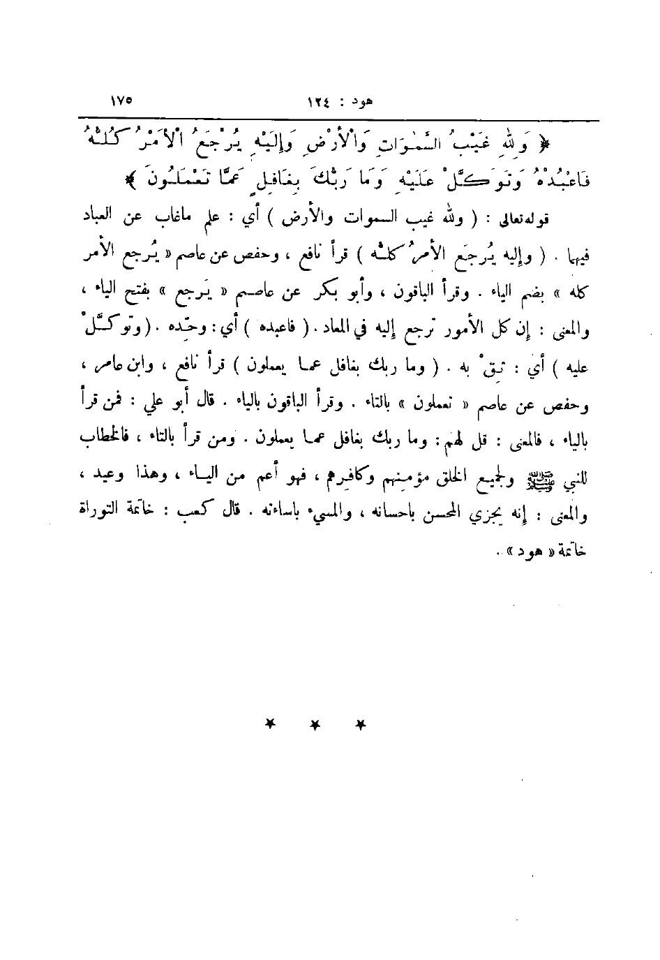 قوله تعالى ولله غيب السموات والأرض أي علم ما غاب عن العباد فيهما وإليه يرجع الأمر كله قرأ نافع وحفص عن عاصم يرجع الأمر كله بضم الياء وقرأ الباقون وأبو بكر عن عاصم يرجع بفتح الياء والمعنى إن كل الأمور ترجع إليه في المعاد فاعبده أي وحده وتوكل عليه أي ثق به وما ربك بغافل عما يعملون قرأ نافع وابن عامر وحفص عن عاصم تعملون بالتاء وقرأ الباقون بالياء قال أبو علي فمن قرأ بالياء فالمعنى قل لهم وما ربك بغافل عما يعملون ومن قرأ بالتاء فالخطاب للنبي صلى الله عليه و سلم ولجميع الخلق مؤمنهم وكافرهم فهو أعم من الياء وهذا وعيد والمعنى إنه يجزي المحسن باحسانه والمسيء باساءته قال كعب خاتمة التوراة خاتمة هود