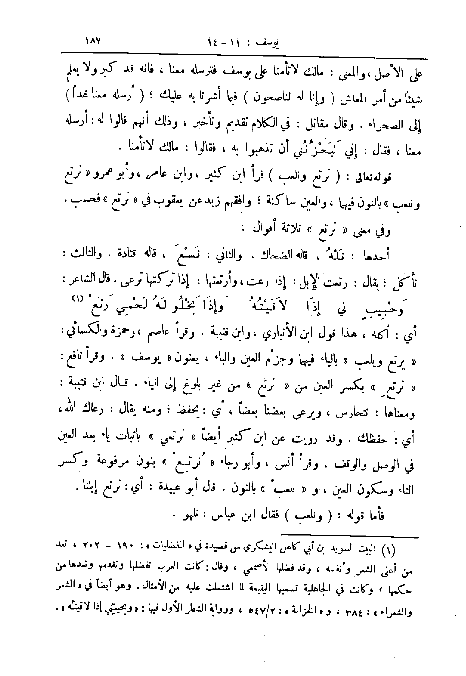 أي أكله هذا قول ابن الأنباري وابن قتيبة وقرأ عاصم و حمزة والكسائي يرتع ويلعب بالياء فيهما وجزم العين والباء يعنون يوسف وقرأ نافع نرتع بكسر العين من نرتع من غير بلوغ إلى الياء قال ابن قتيبة ومعناها نتحارس ويرعى بعضنا بعضا أي يحفظ ومنه يقال رعاك الله أي حفظك وقد رويت عن ابن كثير أيضا نرتعي باثبات ياء بعد العين في الوصل والوقف وقرأ أنس وأبو رجاء نرتع بنون مرفوعة وكسر التاء وسكون العين و نلعب بالنون قال أبو عبيدة أي نرتع إبلنا