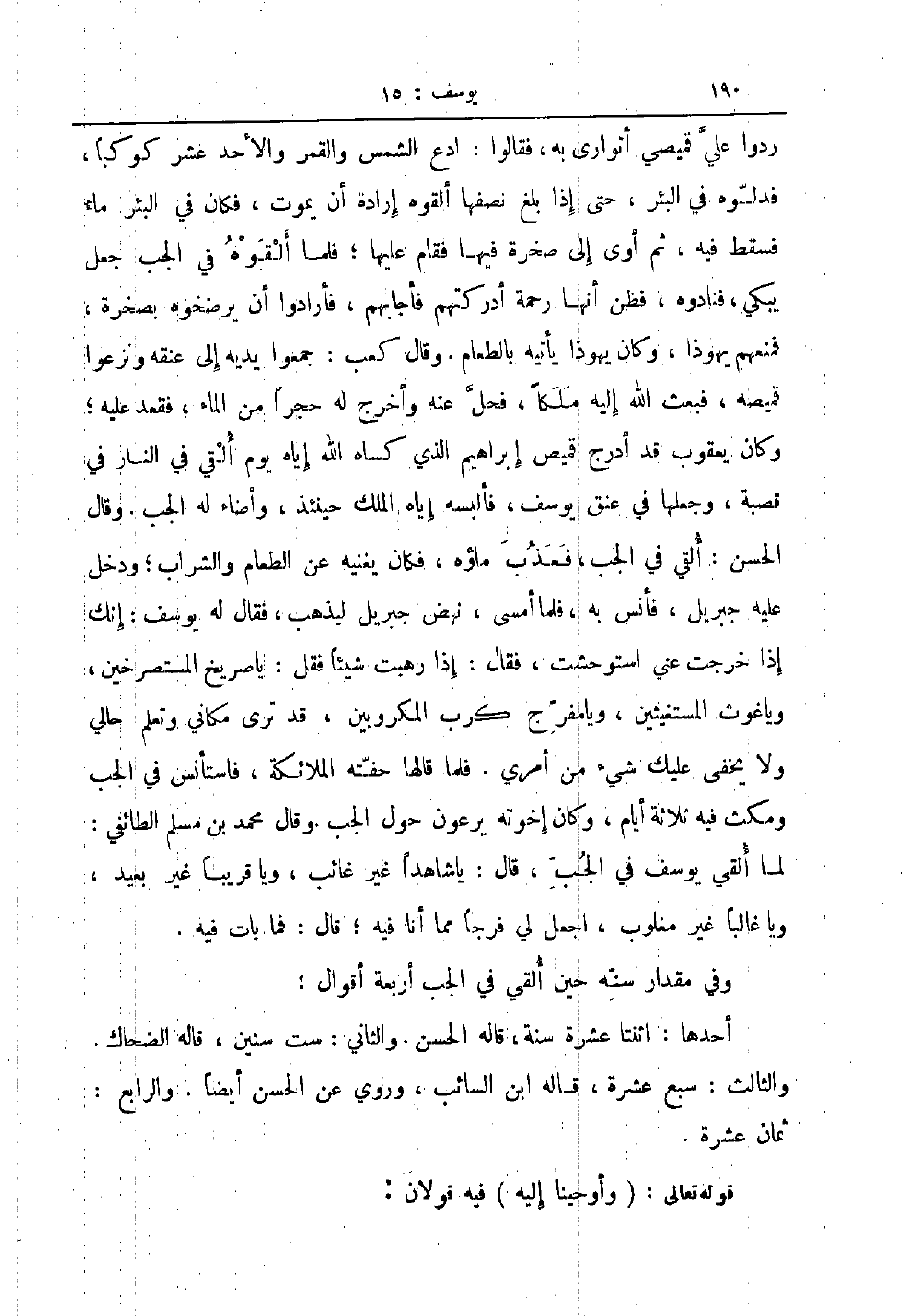 ردوا علي قيمصي أتوارى به فقالوا ادع الشمس والقمر والأحد عشر كوكبا فدلوه في الئر حتى إذا بلغ نصفها ألقوه إرادة أن يموت فكان في البئر ماء فسقط فيه ثم أوى إلى صخرة فيها فقام عليها فلما ألقوه في الجب جعل يبكي فنادوه فظن أنها رحمة أدركتهم فأجابهم فأرادوا أن يرضخوه بصخرة فمنعهم يهوذا وكان يهوذا يأتيه بالطعام وقال كعب جمعوا يديه إلى عنقه ونزعوا قميصه فبعث الله إليه ملكا فحل عنه وأخرج له حجرا من الماء فقعد عليه وكان يعقوب قد أدرج قميص إبراهيم الذي كساه الله إياه يوم ألقي في النار في قصبة وجعلها في عنق يوسف فألبسه إياه الملك حينئذ وأضاء له الجب وقال الحسن ألقي في الجب فعذب ماؤه فكان يغنيه عن الطعام والشراب ودخل عليه جبريل فأنس به فلما أمسى نهض جبريل ليذهب فقال له يوسف إنك إذا خرجت عني استوحشت فقال إذا رهبت شيئا فقل يا صريخ المستصرخين وياغوث المستغيثنين ويا مفرج كرب المكروبين قد ترى مكاني وتعلم حالي ولا يخفى عليك شيء من أمري فلما قالها حفته الملائكة فاستأنس في الجب ومكث فيه ثلاثة أيام وكان إخوته يرعون حول الجب وقال محمد بن مسلم الطائفي لما ألقي يوسف في الجب قال يا شاهدا غير غائب ويا قريبا غير بعيد ويا غالبا غير مغلوب اجعل لي فرجا مما أنا فيه قال فما بات فيه