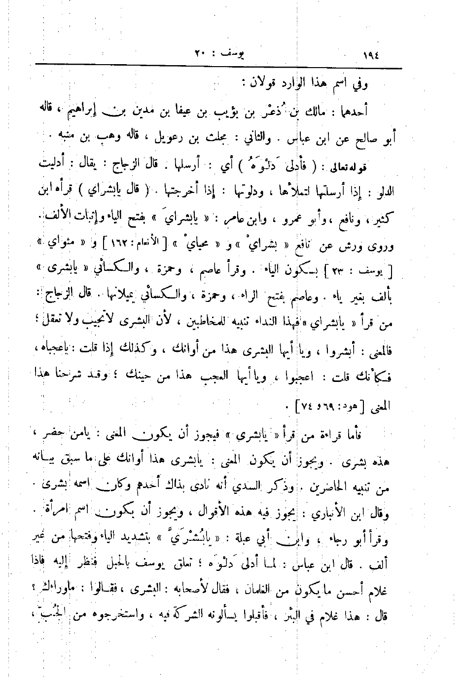 قوله تعالى فأدلى دلوه أي أرسلها قال الزجاج يقال أدليت الدلو إذا أرسلتها لتملأها ودلوتها إذا أخرجتها قال يا بشراي قرأه ابن كثير ونافع وأبو عمرو وابن عامر يا بشراي بفتح الياء وإثبات الألف وروى ورش عن نافع بشراي و محياي الأنعام 162 و مثواي يوسف 23 بسكون الياء وقرأ عاصم وحمزة والكسائي يا بشرى بألف بغير ياء وعاصم بفتح الراء وحمزة والكسائي يميلانها قال الزجاج من قرأ يا بشراي فهذا النداء لتنبيه للمخاطبين لأن البشرى لا تجيب ولا تعقل فالمعنى أبشروا ويا أيها البشرى هذا من أوانك وكذلك إذا قلت يا عجباه فكأنك قلت اعجبوا ويا أيها العجب هذا من حينك وقد شرحنا هذا المعنى هود 69 و 74