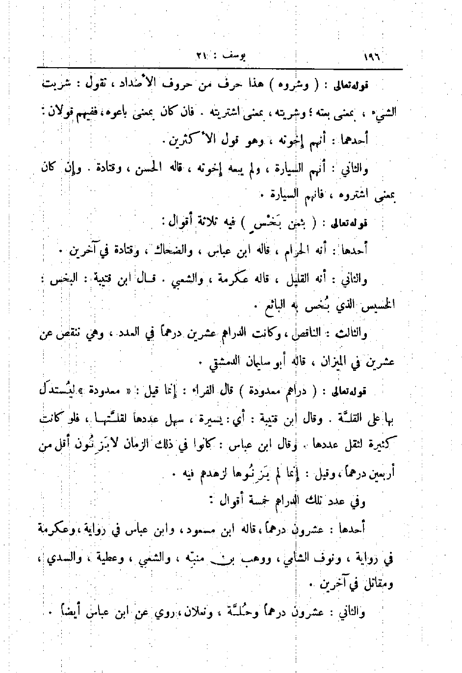 قوله تعالى دراهم معدودة قال الفراء إنما قيل معدودة ليستدل بها على القلة وقال ابن قتيبة أي يسيرة سهل عددها لقلتها فلو كانت كثيرة لثقل عددها وقال ابن عبسا كانوا في ذلك الزمان لا يزنون أقل من أريعين درهما وقيل إنما لم يزنوها لزهدهم فيه