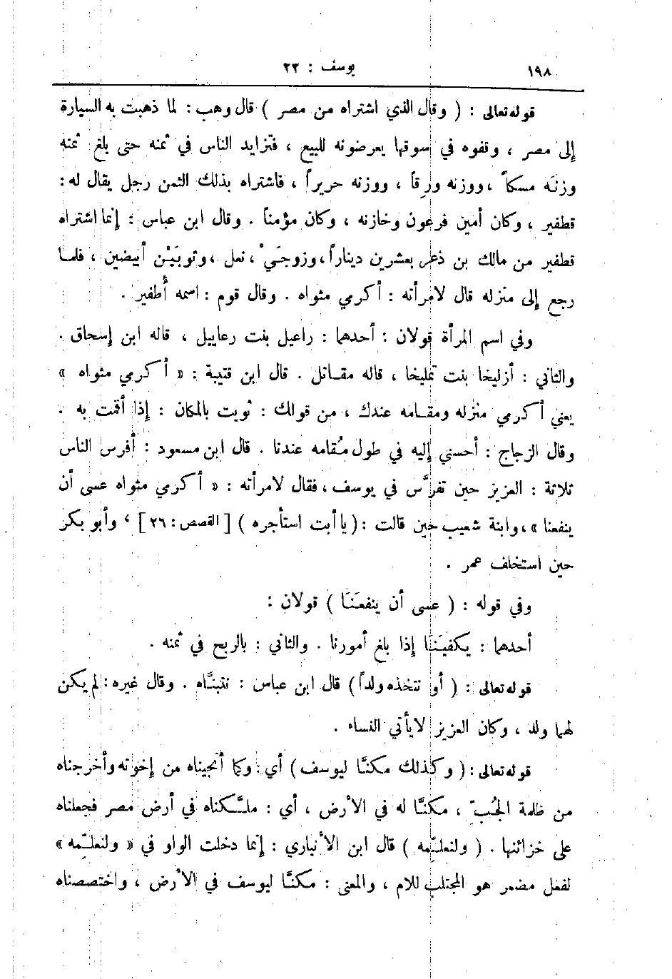 قوله تعالى وقال الذي اشتراه من مصر قال وهب لما ذهبت به السيارة إلى مصر وقفوه في سوقها يعرضونه للبيع فتزايد الناس في ثمنه حتى بلغ ثمنه وزنه مسكا ووزنه ورقا ووزنه حريرا فاششتراه بذلك الثمن رجل يقال له قطفير وكان أمين فرعون وخازنه وكان مؤمنا وقال ابن عباس إنما اشتراه قطفير من مالك بن ذعر بعشرين دينارا وزوجي نعل وثوبين أبيضين فلما رجع إلى منزله قال لامرأته أكرمي مثواه وقال قوم اسمه أطفير
