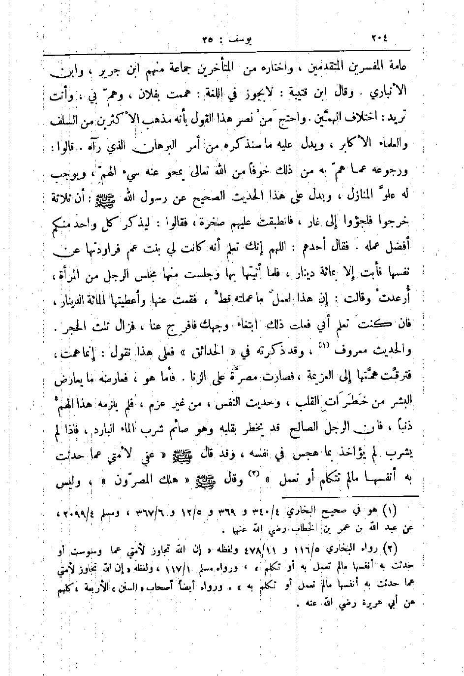 عامة المفسرين المتقدمين واختاره من المتاخرين جماعة منهم ابن جرير وابن الأنباري وقال ابن قتيبة لا يجوز في اللغة هممت بفلان وهم بي وأنت تريد اختلاف الهمين واحتج من نصر هذا القول بأنه مذهب الأكثرين من السلف والعلماء الأكابر ويدل عليه ما سنذكره من أمر البرهان الذي رآه قالوا ورجوعه عما هم به من ذلك خوفا من الله تعالى يمحو عنه سيء الهم ويوجب له علو المنازل ويدل على هذا الحديث الصحيح عن رسول الله صلى الله عليه و سلم أن ثلاثة خرجوا فلجؤوا إلى غار فانطبقت عليهم صخرة فقالوا ليذكر كل واحد منكم أفضل عمله فقال أحدهم اللهم إنك تعلم أنه كانت لي بنت عم فراودتها عن نفسها فأبت إلا بمائة دينار فلما أتيتها بها وجلست منها مجلس الرجل من المرأة أرعدت وقالت إن هذا لعمل ما عملته قط فقمت عنها وأعطيتها المائة الدينار فإن كنت تعلم أني فعلت ذلك ابتغاء وجهك فافرج عنا فزال ثلث الحجر والحديث معروف وقد ذكرته في الحدائق فعلى هذا نقول إنما همت فترقت همتها إلى العزيمة فصارت مصرة على الزنا فأما هو فعارضه ما يعارض البشر من خطرات القلب وحديث النفس من غير عزم فلم يلزمه هذا الهم ذنبا فإن الرجل الصالح قد يخطر بقلبه وهو صائم شرب الماء البارد فإذا لم يشرب لم يؤاخذ بما هجس في نفسه وقد قال صلى الله عليه و سلم عفي لأمتي عما حدثت به أنفسها مالم تتكلم أو تعمل وقال صلى الله عليه و سلم هلك المصرون وليس