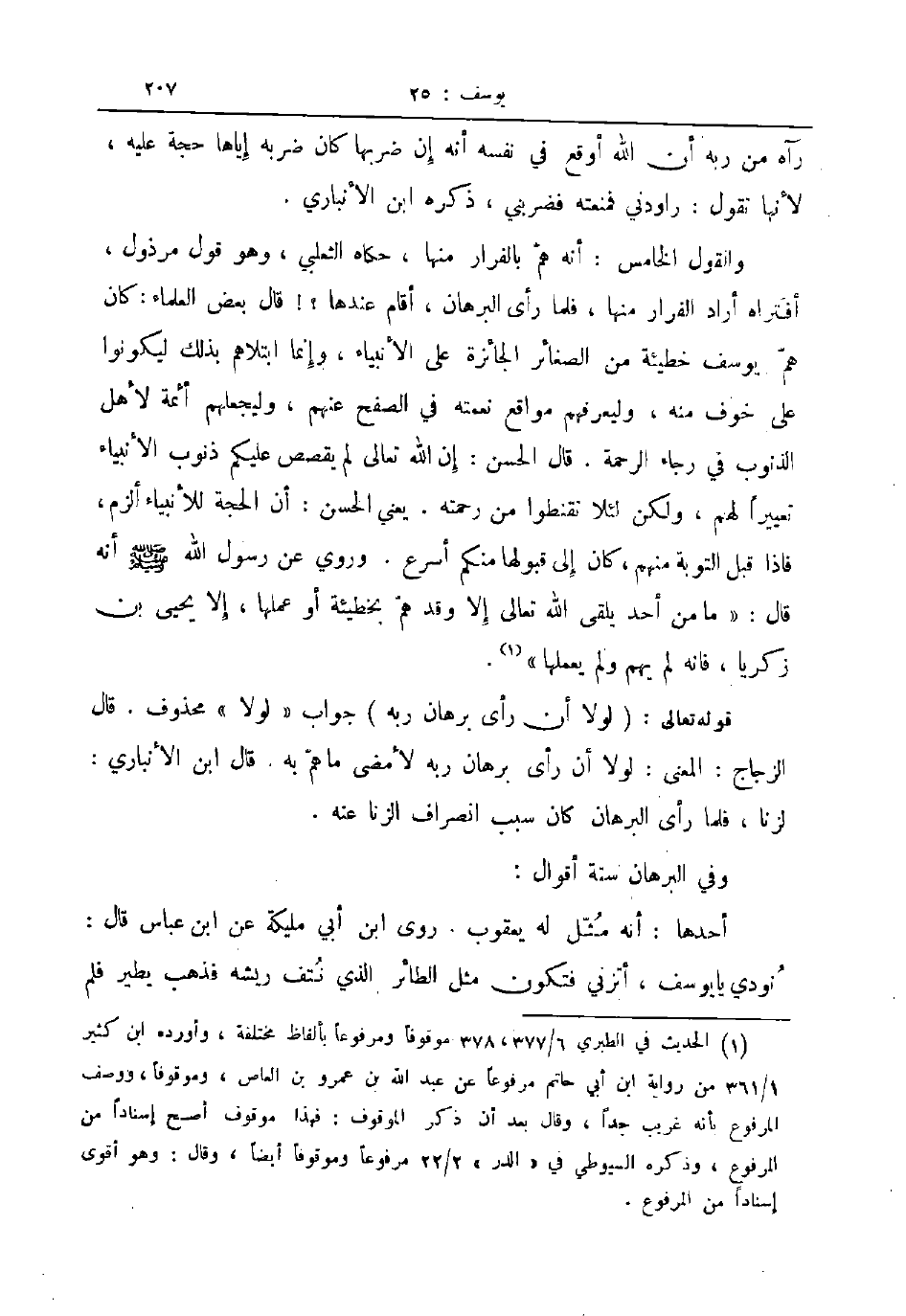 والقول الخامسس أنه هم بالفرار منها حكاه الثعلبي وهو قول مرذول أفتراه أراد الفرار منها فلما رأى البرهان أقام عندها قال بعض العلماء كان هم يوسف خطيئة من الصغائر الجائزة على الأنبياء وإنما ابتلاهم بذلك ليكونوا علىخوف منه وليعرفهم مواقع نعمته في الصفح عنهم وليجعلهم أئمة لأهل الذنوب في رجاء الرحمة قال الحسن إن الله تعالى لم يقصص عليكم ذنوب الأنبياء تعبيرا لهم ولكن لئلا تقنطوا من رحمته يعني الحسن أن الحجة للأنبياء ألزم فإذا قبل التوبة منهم كان إلى قولها منكم أسرع وروي عن رسول الله صلى الله عليه و سلم أنه قال ما من أحد يلقى الله تعالى إلا وقد هم بخطيئة أو عملها إلى يحيى بن زكريا فإنه لم يهم ولم يعملها