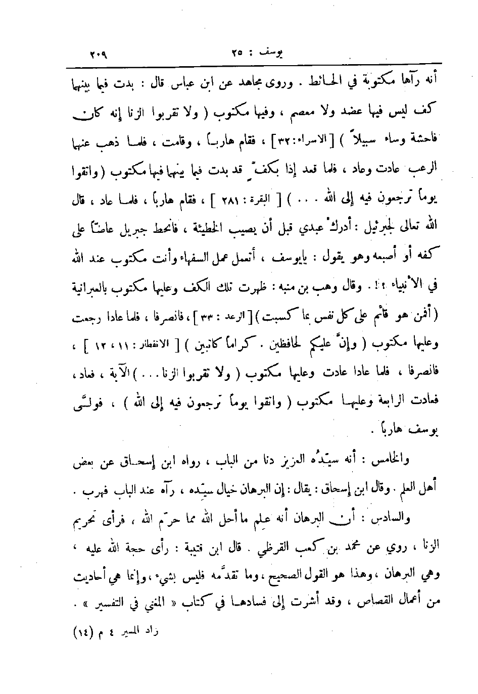 أنه رآهامكتوبة في الحائط وروى مجاهد عن ابن عباس قال بدت فيما بينهما كف ليس فيها عضد ولا معصم وفيها مكتوب ولا تقربوا الزنا إنه كان فاحشة وساء سبيلا الاسراء 32 فقام هاربا وقامت فلما ذهب عنها الرعب عادت وعاد فلما قعد إذا بكف قد بدت فيما بينهما فيها مكتوب واتقوا يوما ترجعون فيه إلى الله البقرة 281 فقام هاربا فلما عاد قال الله تعالى لجبرئيل أدرك عبدي قبل أن يصيب الخطيئة فانحط جبريل عاضا على كفه أو أصبعه وهو يقول يا يوسف أتعمل عمل السفهاء وأنت مكتوب عند الله في الأنبياء وقال وهب بن منبه ظهرت تلك الكف وعليها مكتوب بالعبرانية أفمن هو قائم على كل نفس بما كسبت فانصرفا فلما عادا رجعت وعليها مكتوب وإن عليكم لحافظين كراما كاتبين الأنفطار 11 12 فانصرفا فلما عادا عادت وعليها مكتوب ولا تقربوا الزنا الآية فعاد فعادت الرابعة وعليها مكتوب واتقوا يوما ترجعون فيه إلى الله فولى يوسف هاربا