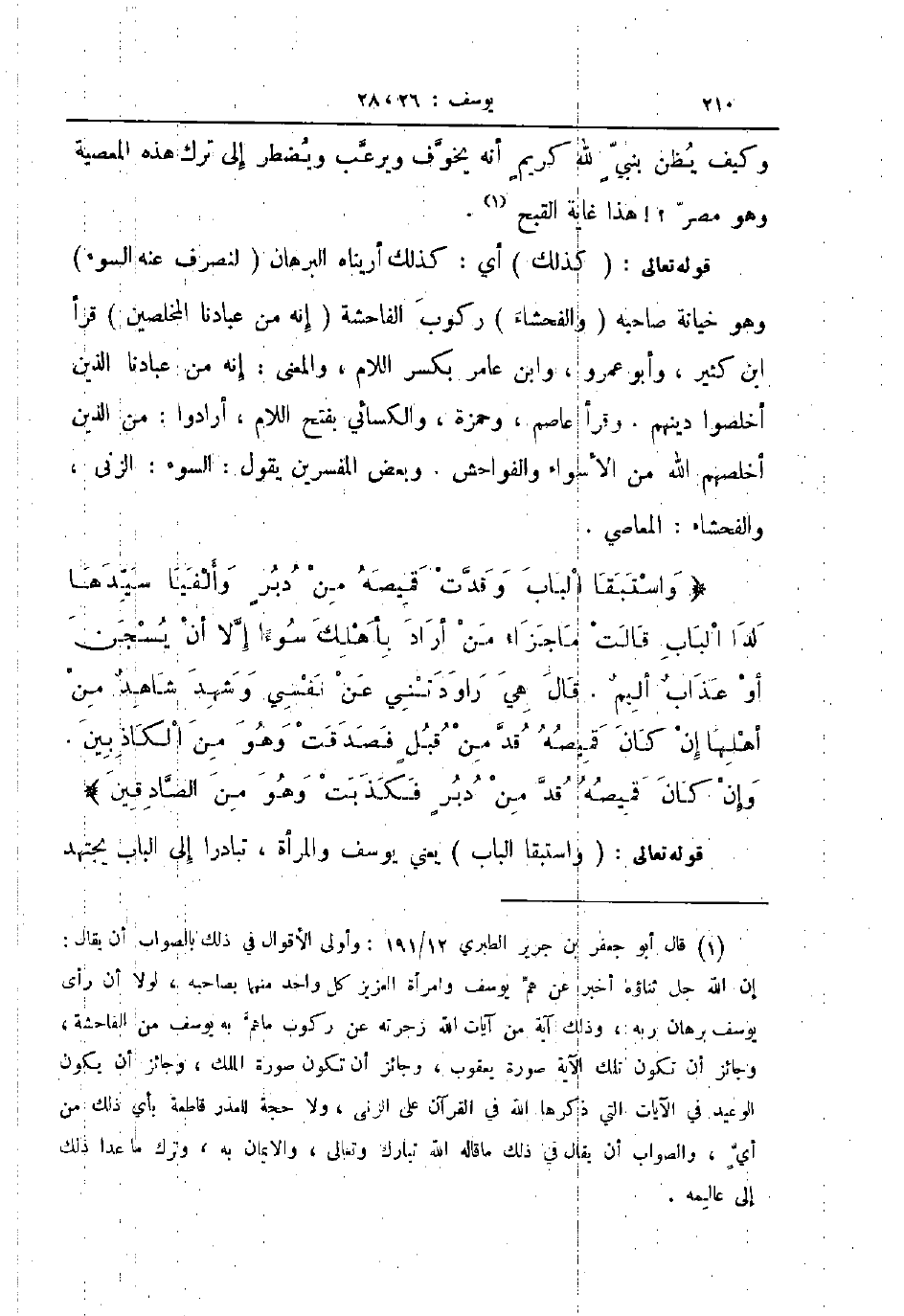 قوله تعالى كذلك أي كذلك أريناه البرهان لنصرف عنه السوء وهوخيانة صاحبه والفحشاء ركوب الفاحشة إنه من عبادنا المخلصين قرأ ابن كثير وأبو عمرو وابن عامر بكسر اللام والمعنى إنه من عبادنا الذين أخلصوا دينهم وقرأ عاصم وحمزة والكسائي بفتح اللام أرادوا من الذين أخلصهم الله من الأسواء والفواحش وبعض المفسرين يقول السوء الزنى والفحشاء المعاصي واستبقا الباب وقدت قميصه من دبر وألفيا سيدها لدا الباب قالت ما جزاء من أراد بأهلك سوءا إلا أن يسجن أو عذاب أليم قال هي راودتني عن نفسي وشهد شاهد من أهلها إن كان قميصه قد من قبل فصدقت وهو من الكاذبين وإن كان قميصه قد من دبر فكذبت وهو من الصادقين