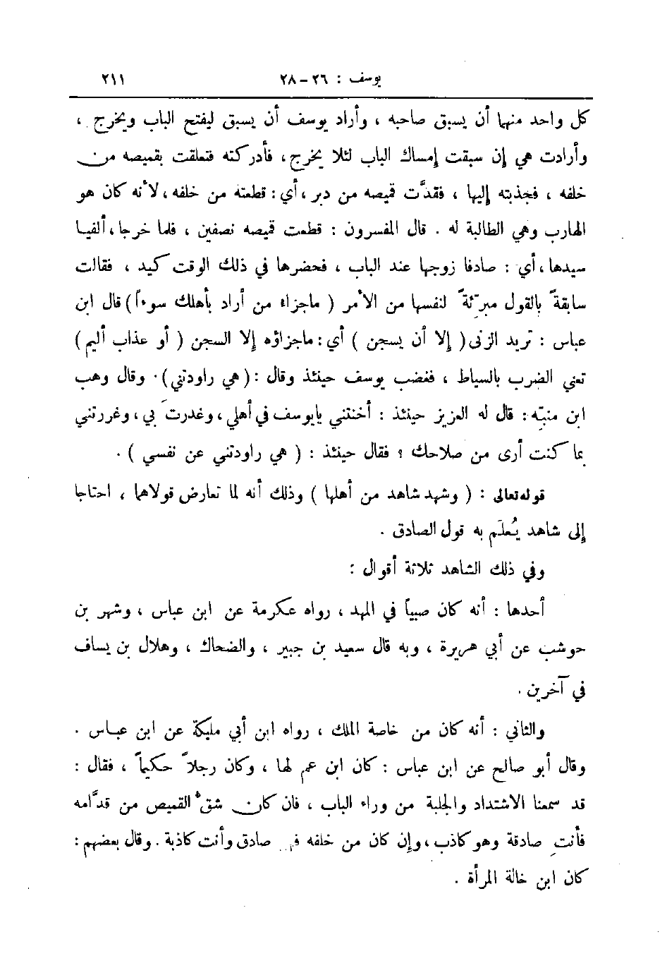 والثاني أنه كان من خاصة الملك رواه ابن أبي مليكة عن ابن عباس وقال أبو صالح عن ابن عباس كان ابن عم لها وكان رجلا حكيما فقال قد سمعنا الاشتداد والجلبة من وراء الباب فإن كان شق القميص من قدامه فأنت صادقة وهو كاذب وإن كان من خلفه فهو صادق وأنت كاذبة وقال بعضهم كان ابن خالة المرأة