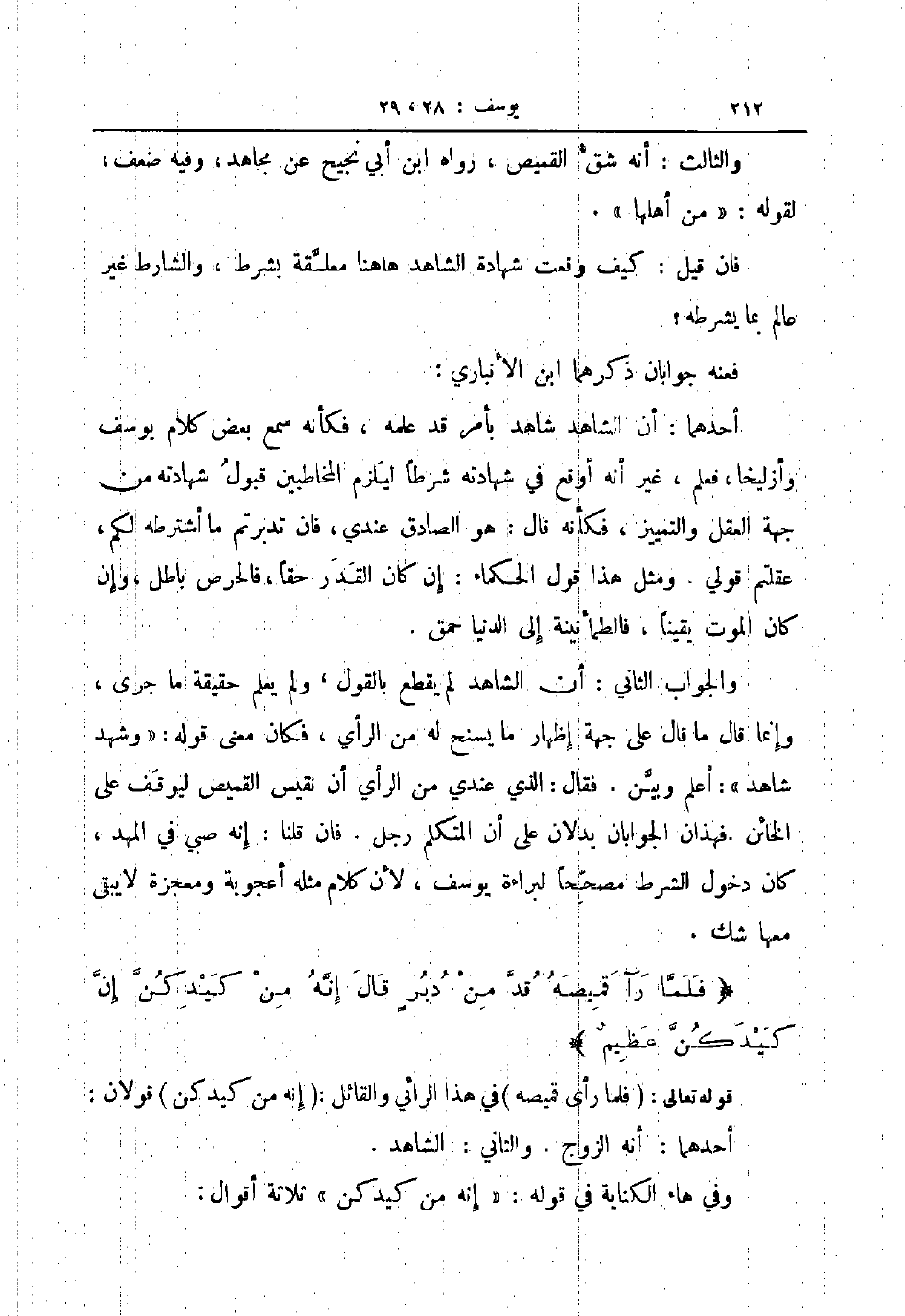 والجواب الثاني أن الشاهد لم يقطع بالقول ولم يعلم حقيقة ما جرى وإنما قال ما قال على جهة إظهار ما يسنح له من الرأي فكان معنى قوله وشهد شاهد أعلم وبين فقال الذي عندي من الرأي أن نقيس القميص ليوقف على الخائن فهذان الجوابان يدلان على أن المتكلم رجل فإن قلنا إنه صبي في المهد كان دخول الشرط مصححا لبراءة يوسف لأن كلام مثله أعجوبة ومعجزة لا يبقى معها شك فلما رآ قميصه قد من دبر قال إنه من كيدكن إن كيدكن عظيم
