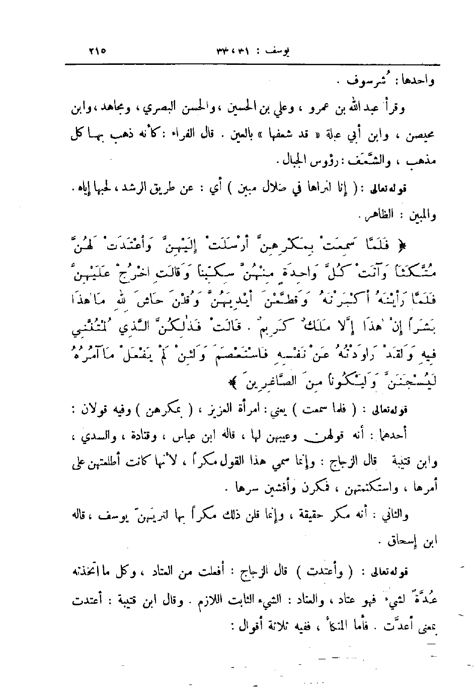 قوله تعالى إنا لنراها في ضلال مبين أي عن طريق الرشد لحبها إياه والمبين الظاهر فلما سمعت بمكرهن أرسلت إليهن وأعتدت لهن متكئا وآتت كل واحدة منهن سكينا وقالت اخرج عليهن فلما رأينه أكبرنه وقطعن أيديهن وقلن حاش لله ما هذا بشرا إن هذا إلا ملك كريم قالت فذلكن الذي لمتنني فيه ولقد راودته عن نفسه فاستعصم ولئن لم يفعل ما آمره ليسجنن وليكونا من الصاغرين
