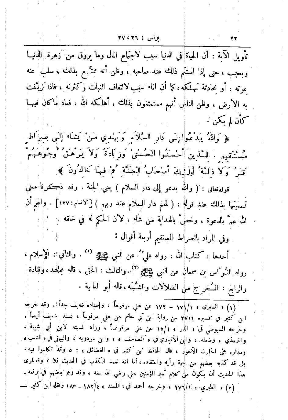تأويل الآية أن الحياة في الدنيا سبب لاجتماع المال وما يروق من زهرة الدنيا ويعجب حتى إذا استتم ذلك عند صاحبه وظن أنه ممتع بذلك سلب عنه بموته أو بحادثة تهلكه كما أن الماء سبب لالتفاف النبات وكثرته فإذا تزينت به الأرض وظن الناس أنهم مستمتعون بذلك أهلكه الله فعاد ما كان فيها كأن لم يكن والله يدعوا إلى دار السلام ويهدي من يشاء إلى صراط مستقيم للذين أحسنوا الحسنى وزيادة ولا يرهق وجوههم قتر ولا ذلة أولئك أصحاب الجنة هم فيها خالدون