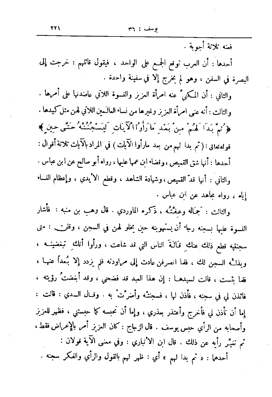 والثالث جماله وعفته ذكره الماوردي قال وهب بن منبه فأشار النسوة عليها بسحنه رجاء أن يستهوينه حين يخلو لهن في السجن وقلن متى سجنتيه قطع ذلك عنك قالة الناس التي قد شاعت ورأوا أنك تبغضينه ويذله السجن لك فلما انصرفن عادت إلى مراودته فلم يزدد إلا بعدا عنها فلما يئست قالت لسيدها إن هذا العبد قد فضحني وقد أبغضت رؤيته فائذن لي في سجنه فأذن لها فسجنته وأضرت به وقال السدي قالت إما أن تأذن لي فأخرج وأعتذر بعذري وإما أن تحبسه كما حبستني فظهر للعزيز واصحابه من الرأي حبس يوسف قال الزجاج كان العزيز أمر بالإعراض فقط ثم تغير رأيه عن ذلك قال ابن الأنباري وفي معنى الآية قولان